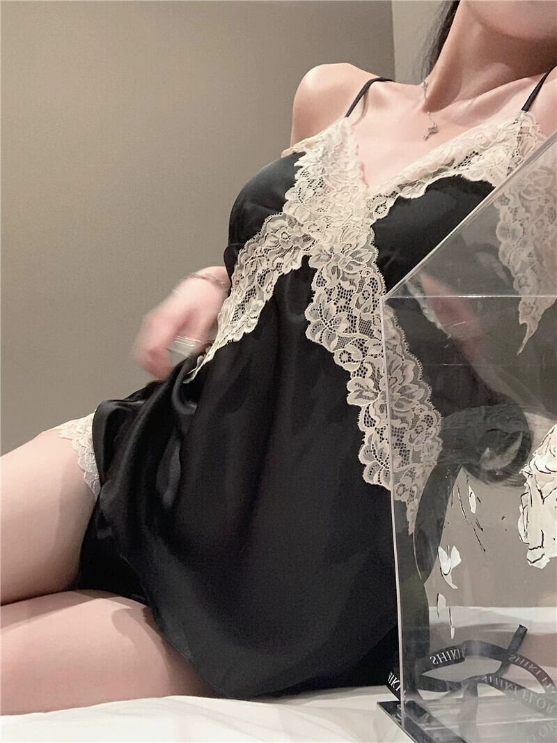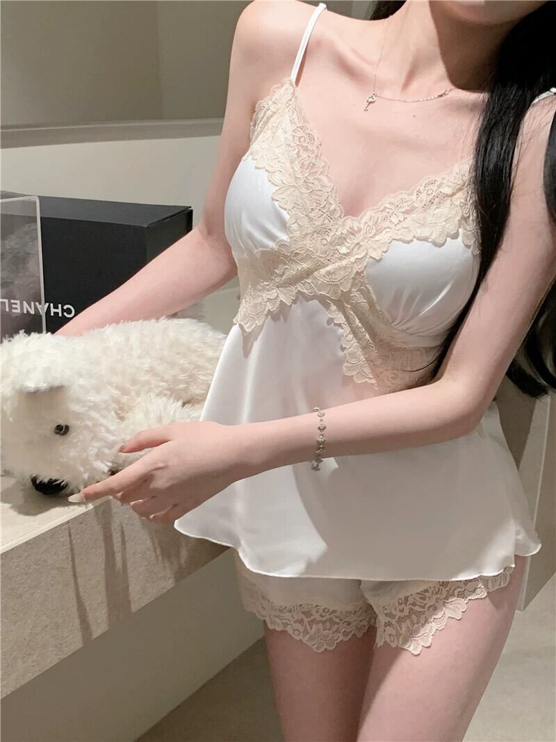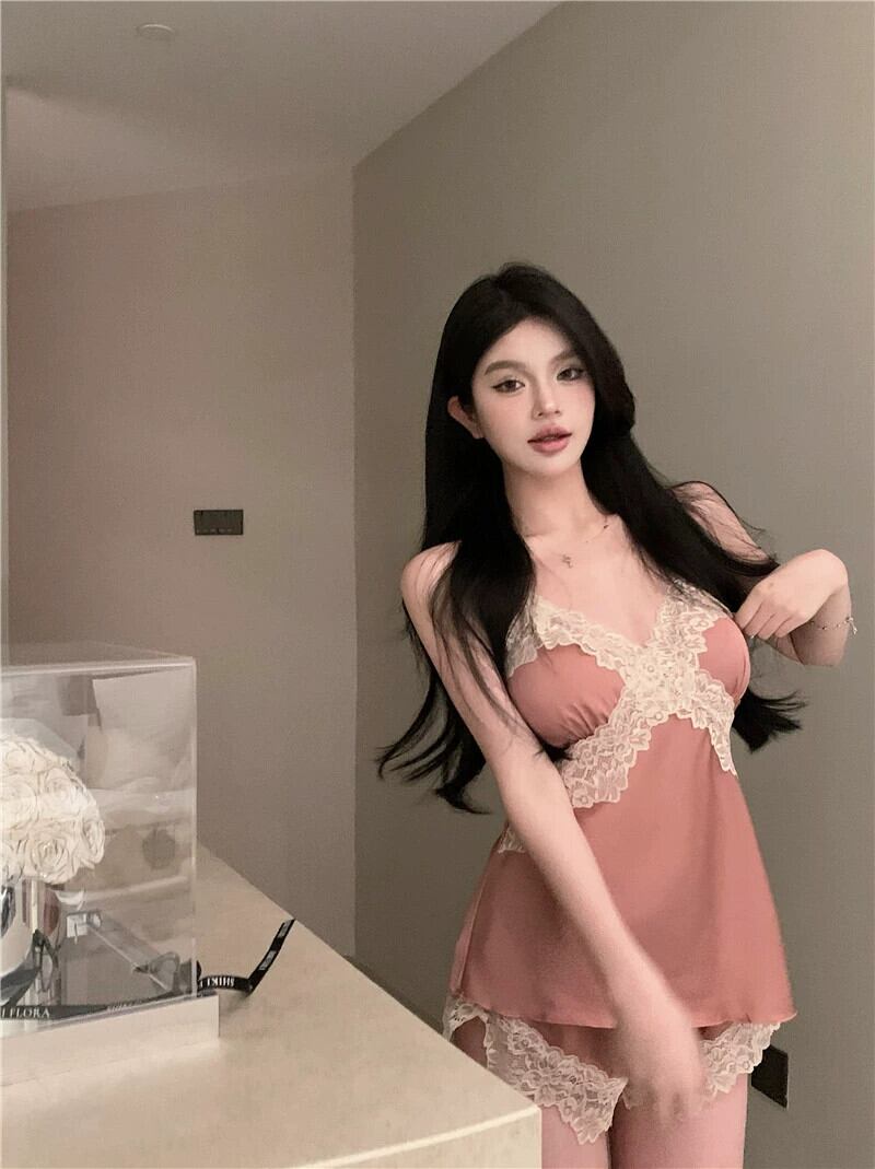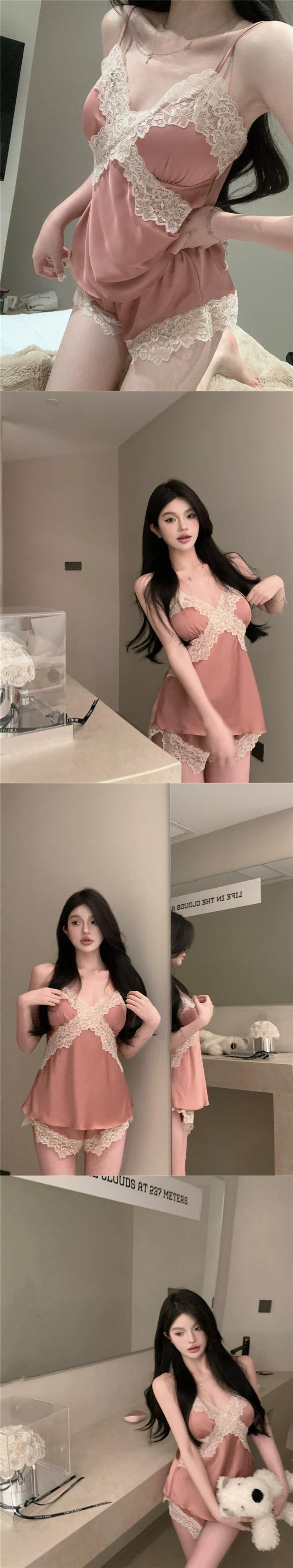セクシーなアイスシルクパジャマセット、胸パッド付き女性、春レースVネックベスト、サスペンダーショーツ、ホームウェア2点セット スプリング 春物 ブルマー 0921970892802732