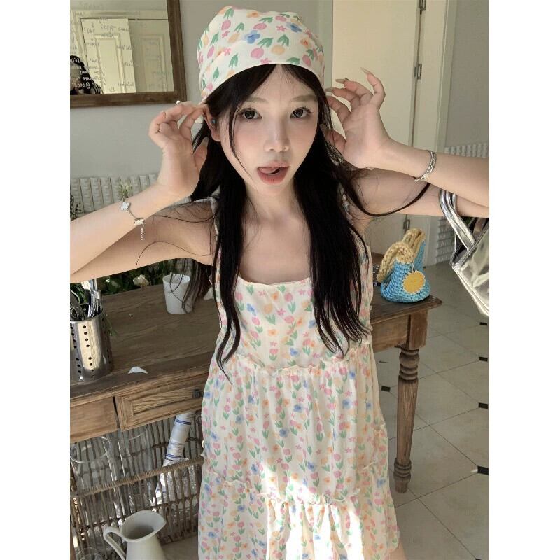 甘くて新鮮な花柄サスペンダードレス女性春純粋な欲望ハイウエストベビードールスカートルーズaラインスカートミドル丈スカート ハイウェスト 大人ガーリー スウィート キュート カジュアル スプリング 春物 ピュア 092194752897448