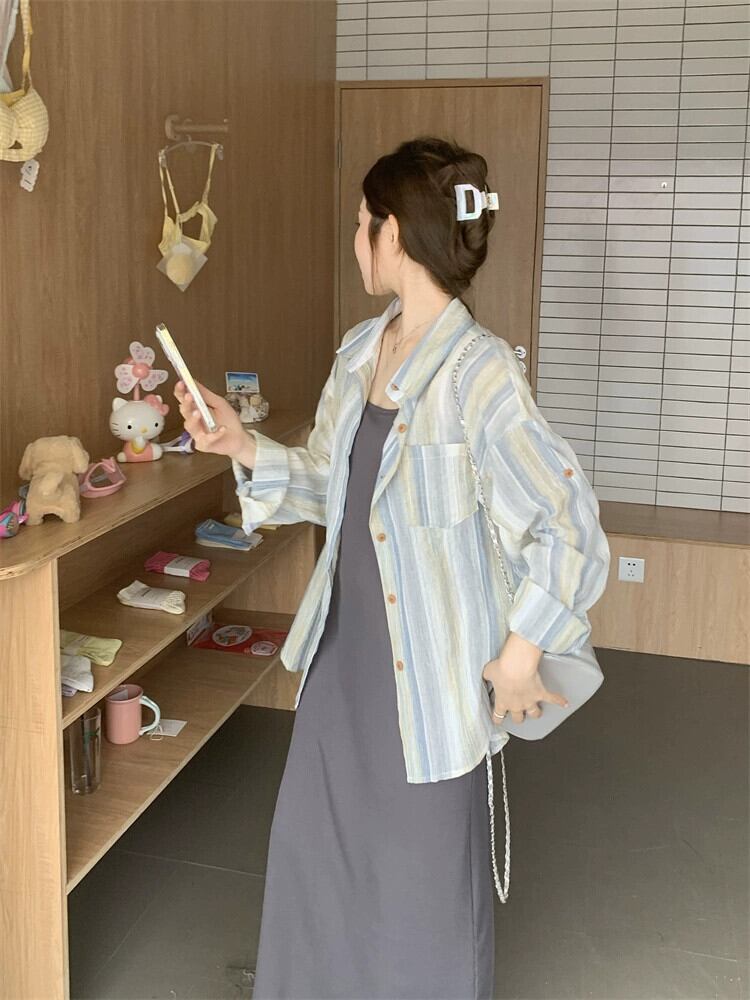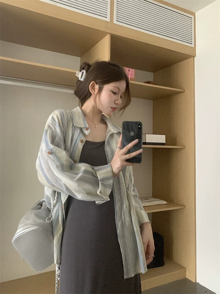 スタイルストライプ日焼け防止薄いシャツジャケット女性春インナーニットサスペンダースカートスリムドレスツーピースセット スプリング 春物 0921994668553111