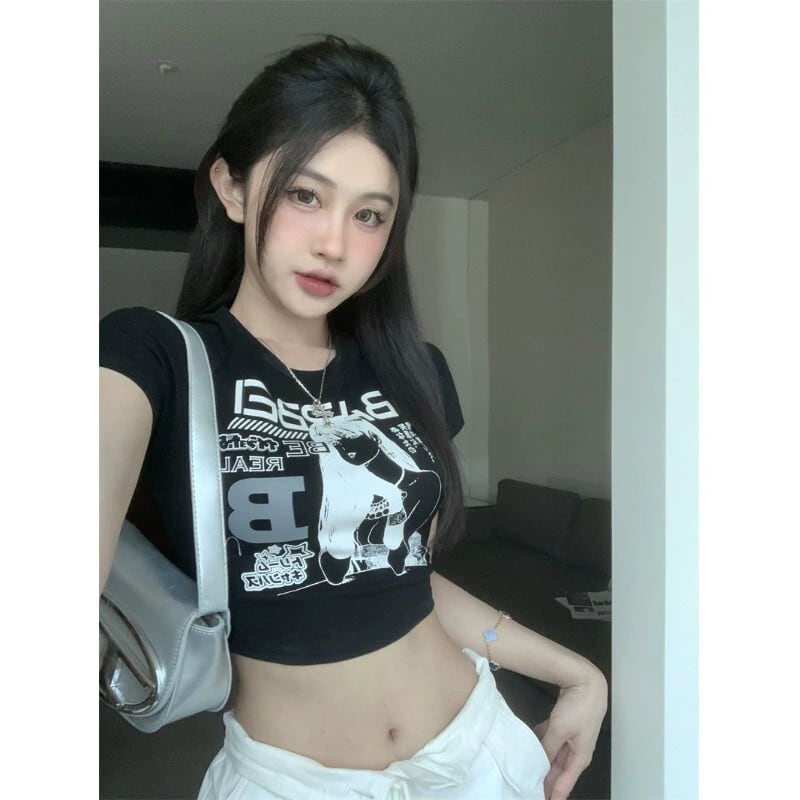 アメリカの甘くてクールなスタイルのプリントショルダー Tシャツ女性 2024 春の新しいショートスリムフィット半袖クロップトップ 大人ガーリー スウィート キュート カジュアル スプリング 春物 0921980406030227