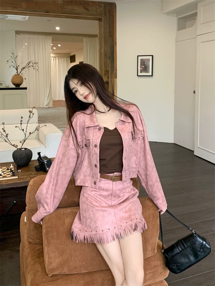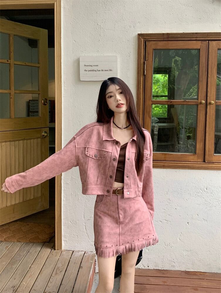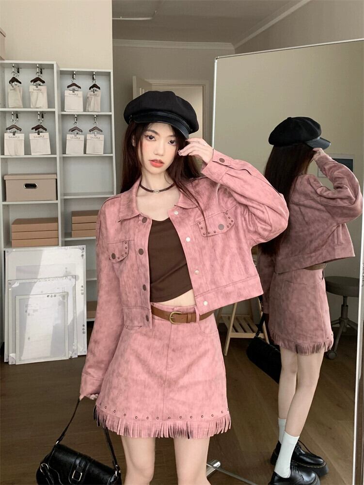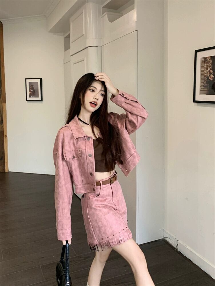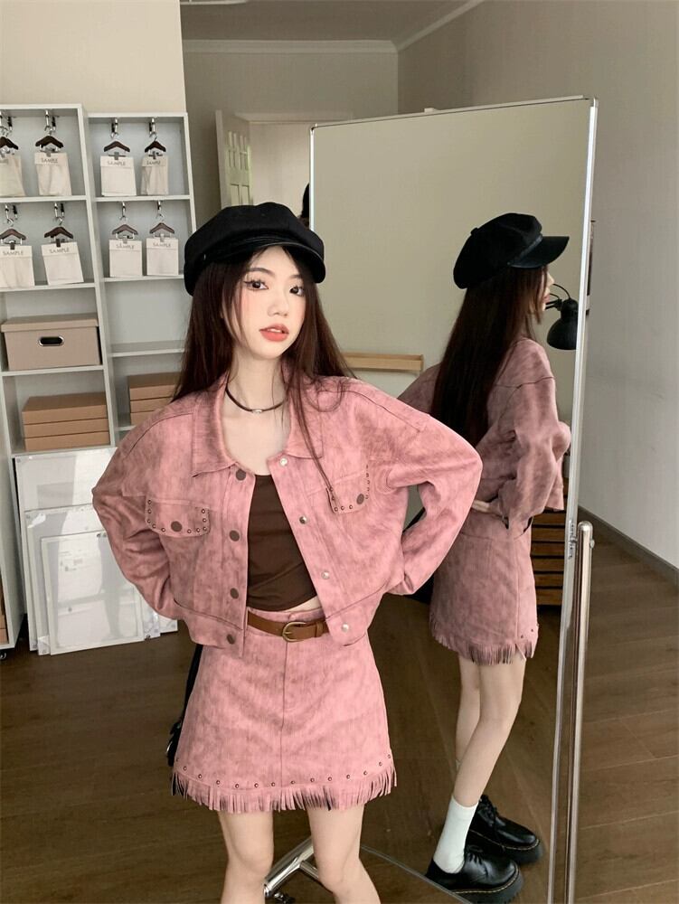レトロ スイート クール ホットガール スーツ レディース 2024 春 ヌバック レザー トップ ジャケット スカート 2 点セット 大人ガーリー スウィート キュート カジュアル スプリング 春物 0921965748844263