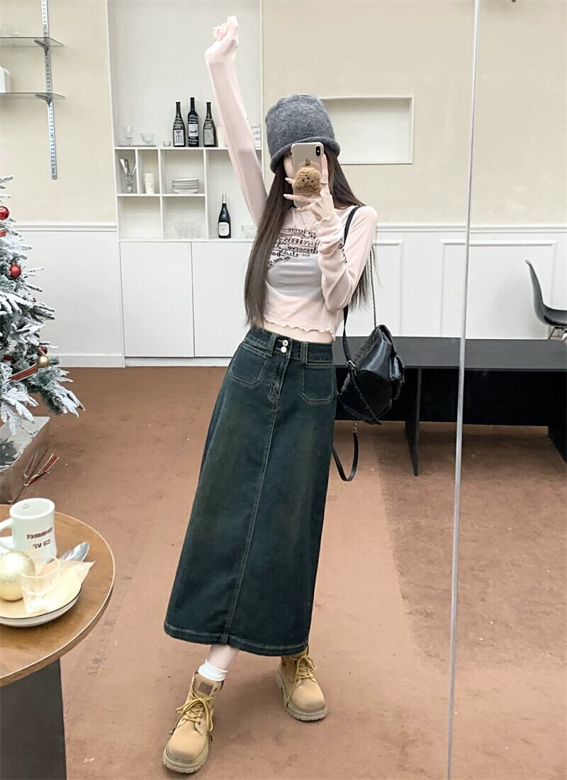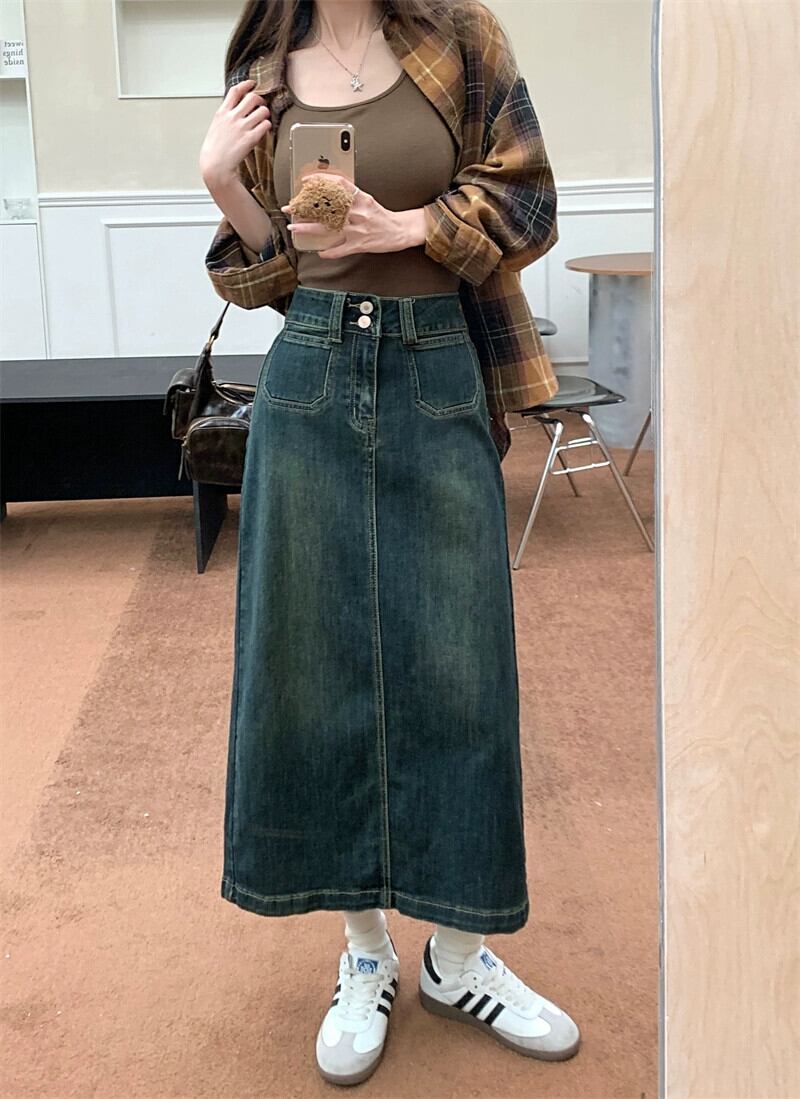 レトロウォッシュデニムスカート女性初春 2024 新作ハイウエストスリム A ラインスカートミッドレングススリットスカート スプリング 春物 Aライン 0921938772938064