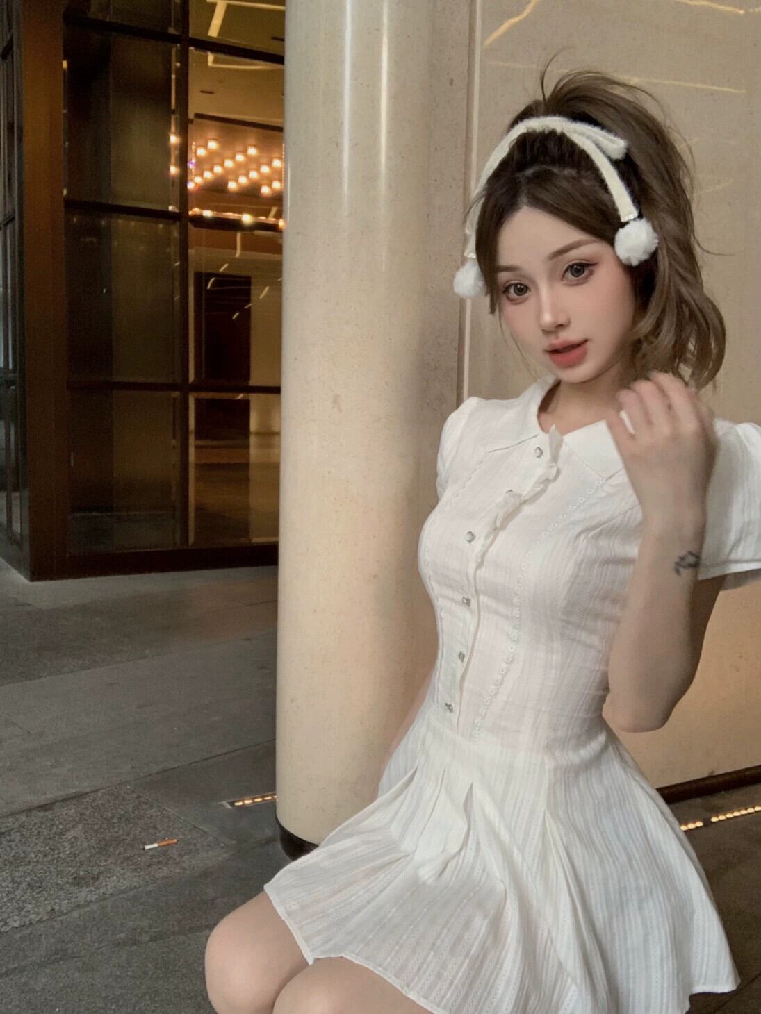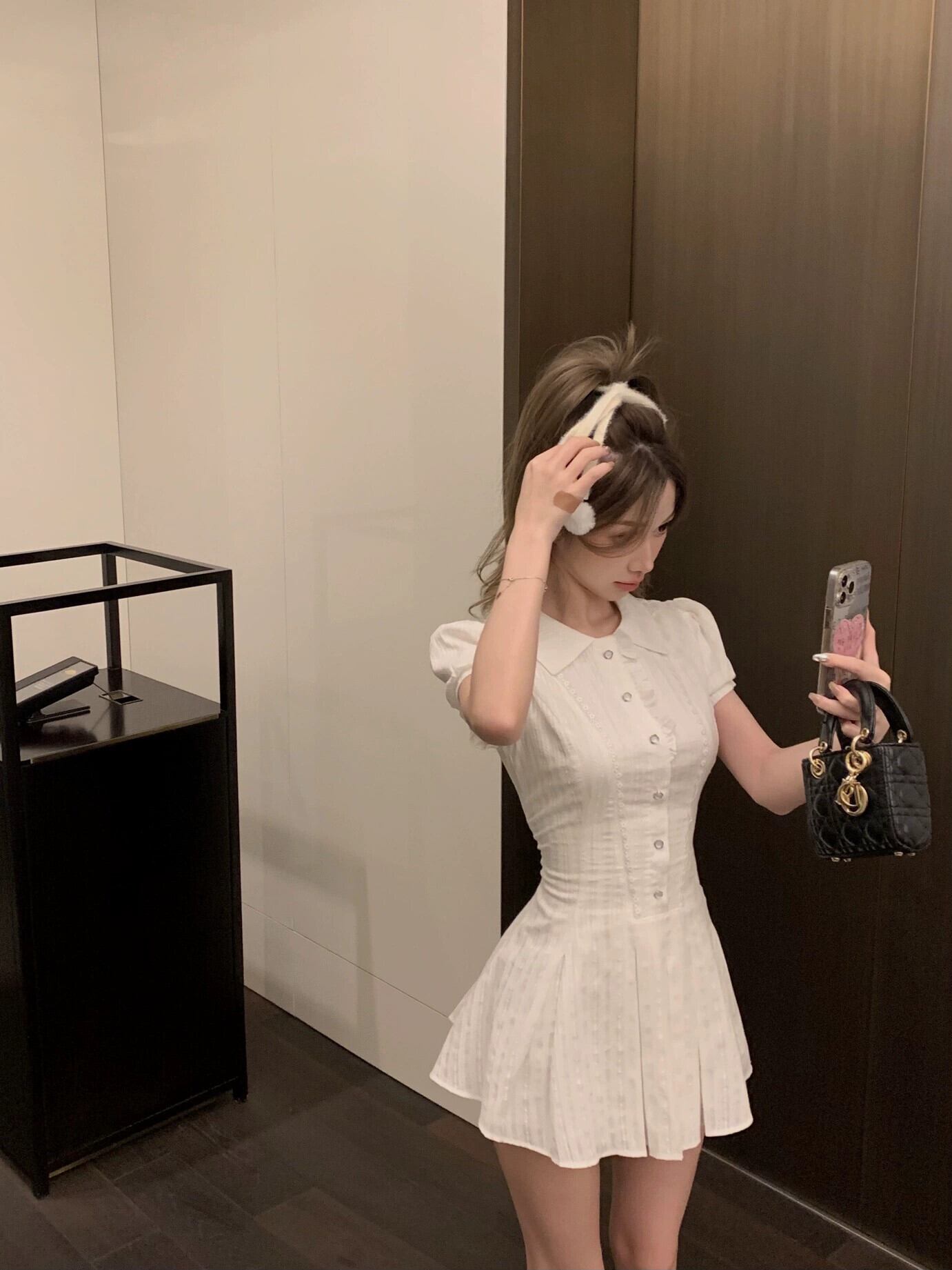 ホワイトパフスリーブシャツドレスレディース早春フレンチシック半袖スカートウエストAラインスカートプリーツショートスカート スプリング 春物 0921986727836086