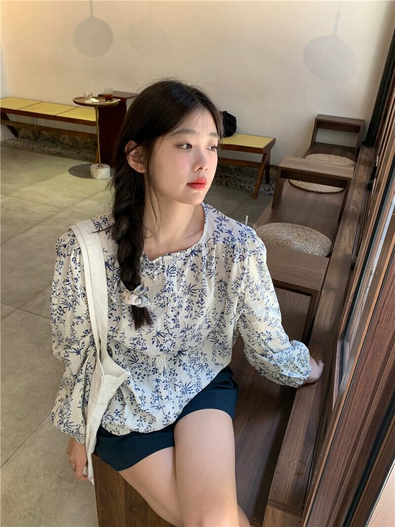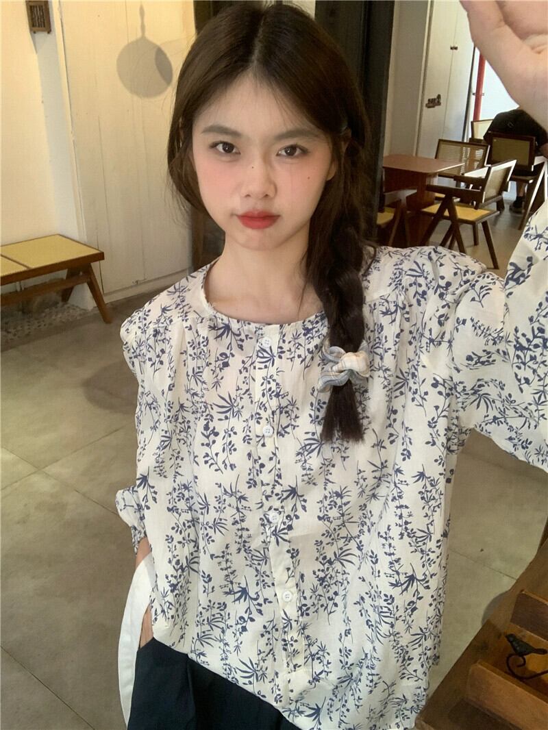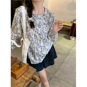 新鮮な花柄長袖シャツ女性 2024 春の新しい甘い多目的ラウンドネックルーズスリムシャツ ロング 大人ガーリー スウィート キュート カジュアル スプリング 春物 Oネック 0921943228082662