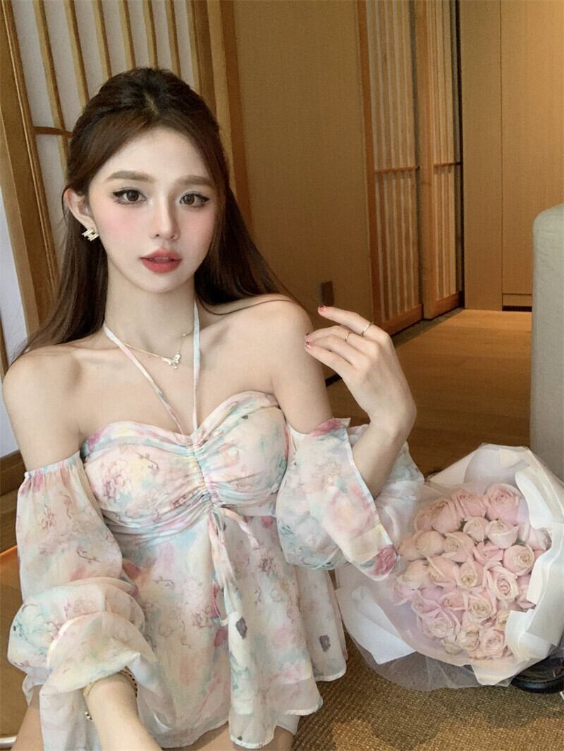 ホルターネック花セクシーなネクタイオフショルダーシャツ女性春 2024 新しいスタイルワンラインカラートランペット長袖ショートトップ ロング スプリング 春物 花柄 0921933200557807