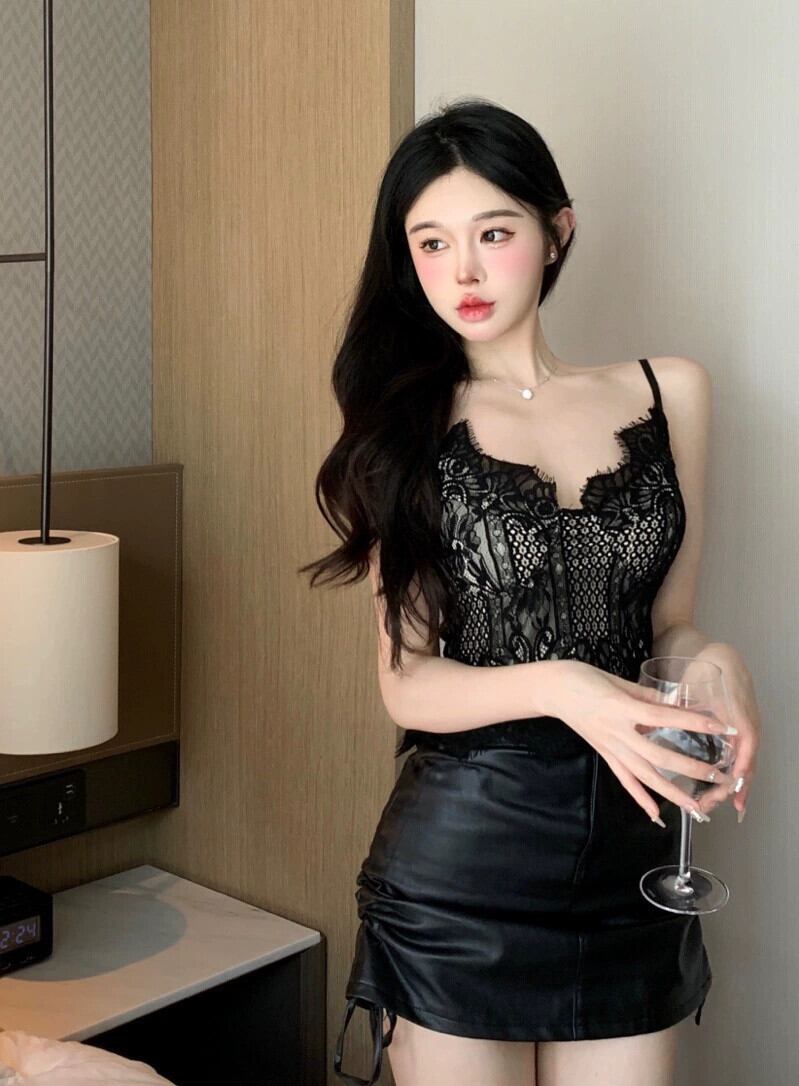 春の V ネックの黒の純粋な欲望スタイルのレース キャミソール女性セクシーなタイトなショート トップ ブラック スプリング 春物 Vネック ピュア 0921996609235186