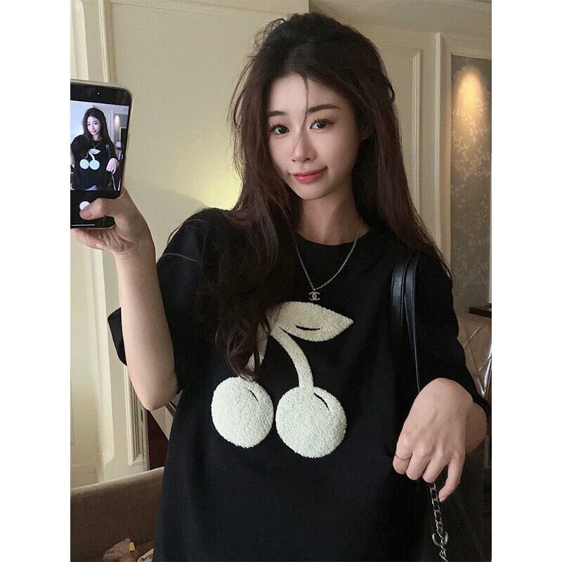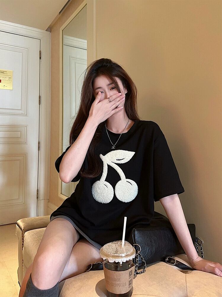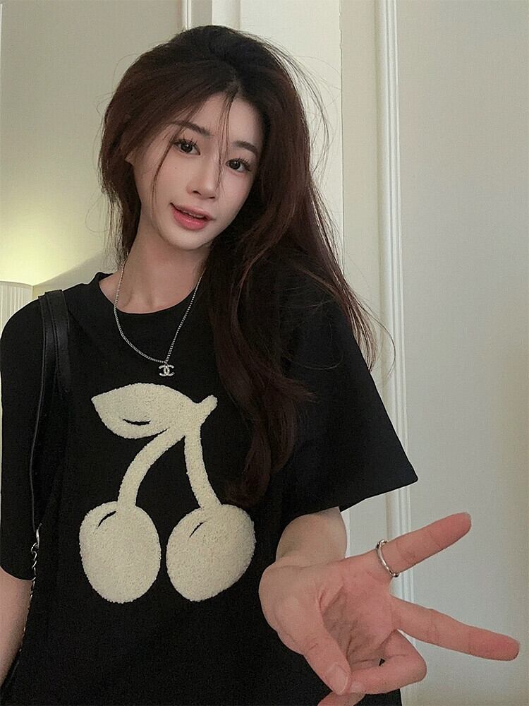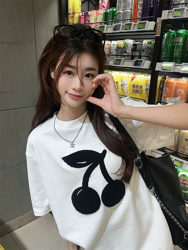 スタイルチェリータオル刺繍半袖ラウンドネック Tシャツ女性 2024 春の新作ルーズ、スリム、ファッショナブルで多用途なトップ レッド スプリング 春物 Oネック 0921936087187463