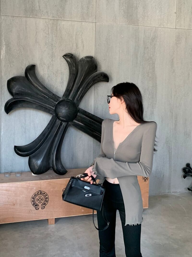黒のダブルジッパー V ネック長袖セーター女性春純粋な欲望セクシーなシックなタイトなスリットトップ ロング ブラック スプリング 春物 Vネック ピュア 0921931700357702