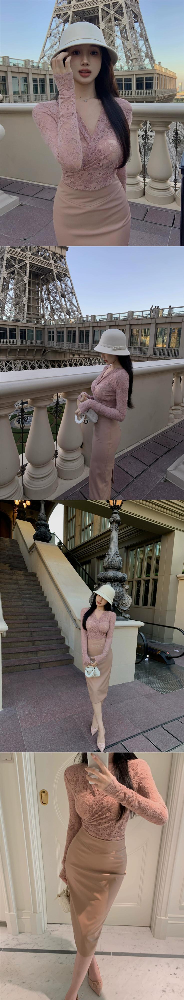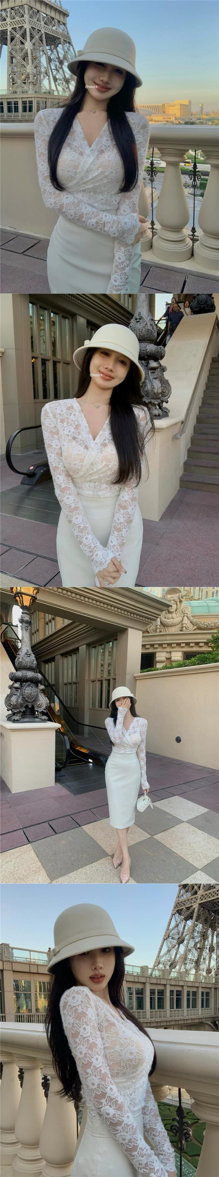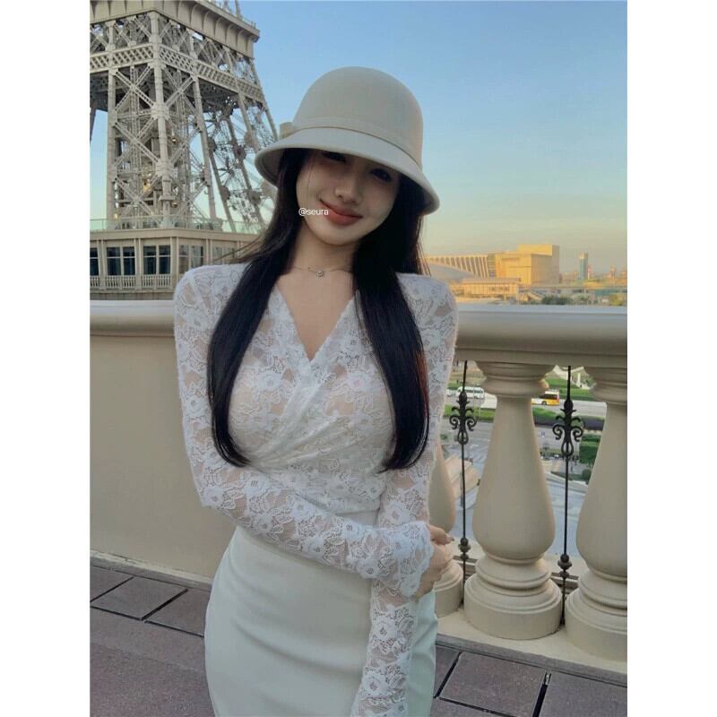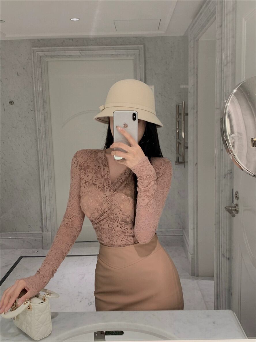 わずかにシースルーのセクシーな V ネック長袖レースシャツ女性 2024 年春の新しいスタイルのプリーツインナートップとスリムフィット ロング スプリング 春物 Vネック 0921951580398316