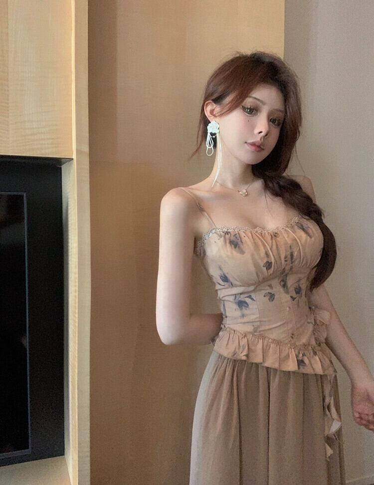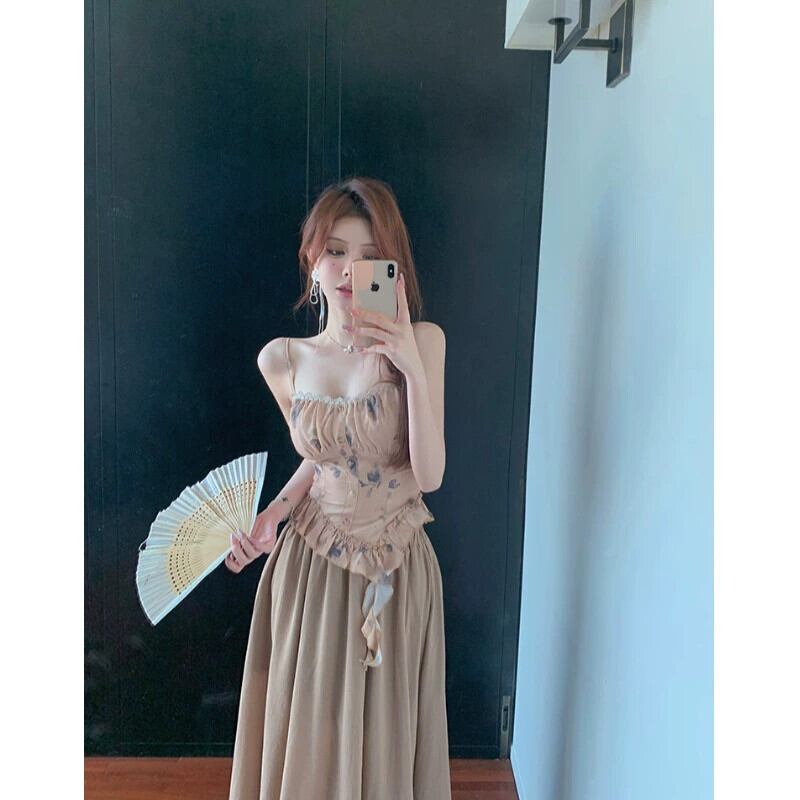 中国風の国民風禅スーツ女性 2024 春の新プリントキャミソールハイウエストスカート 2 点セット ハイウェスト スプリング 春物 0921967818281105
