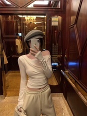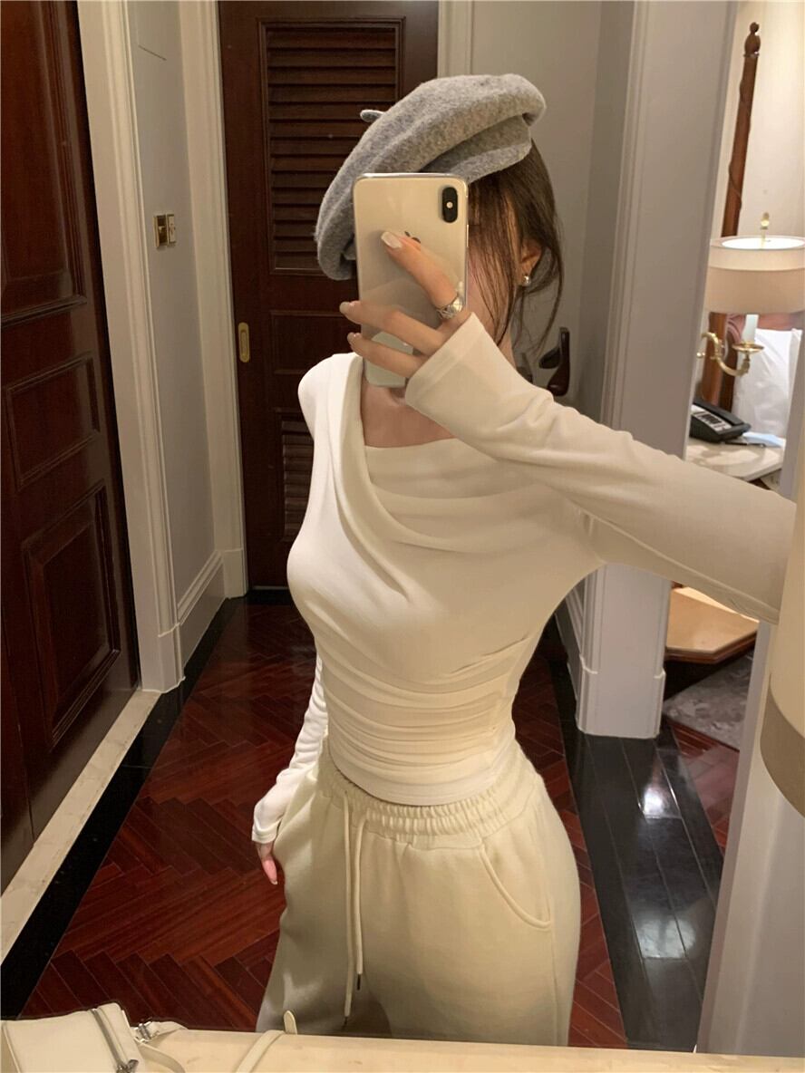 純粋な欲望スイング襟長袖 Tシャツ底トップ女性の秋と冬のセクシーなプリーツウエストタイトなショートインナートップ ロング オータム 秋物 ウィンター 冬物 0921932569392489