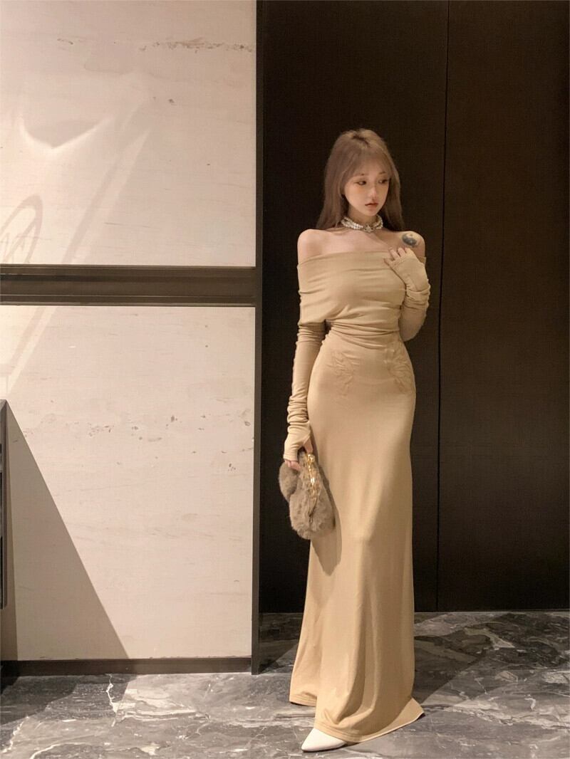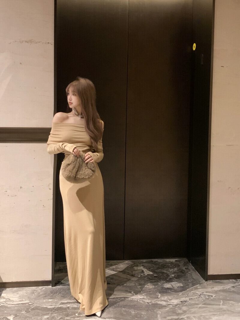 気質三次元蝶刺繍長袖ドレスの女性の春 2024 新しいハイエンドニッチウエストニットスカート ロング レッド スプリング 春物 0921998890865683