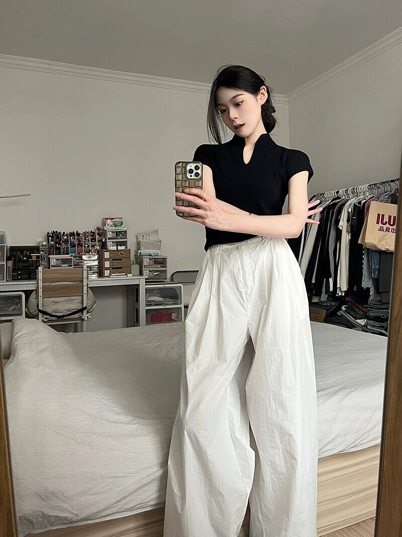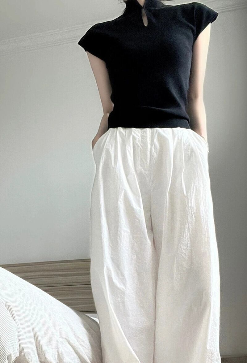 スーツ女性春の新中国風プレートボタンスタンドカラー半袖トップ白カジュアルパンツワイドレッグパンツ 2 点セット ホワイト スプリング 春物 0921923394909987
