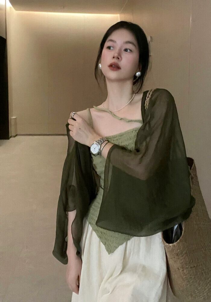 色:ダークグリーンのカーディガン,ビーングリーンスリング,アプリコットスカート