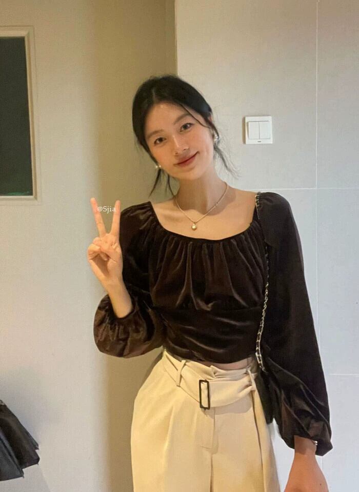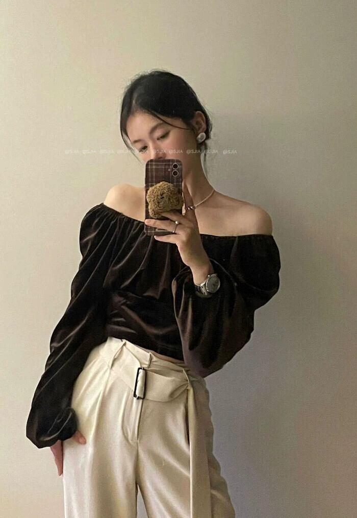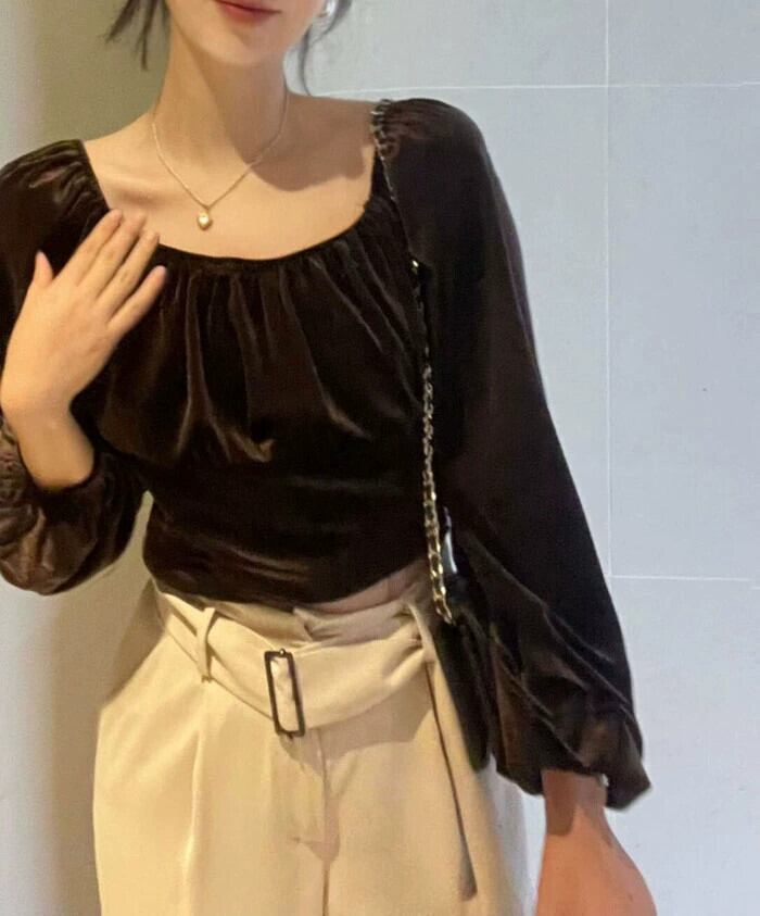 フランスのワンショルダー長袖ベルベットシャツの女性の 2024 年春の新しいスタイルの気質ハイエンドスリムハイウエストショートトップ ロング スプリング 春物 0921918894967883