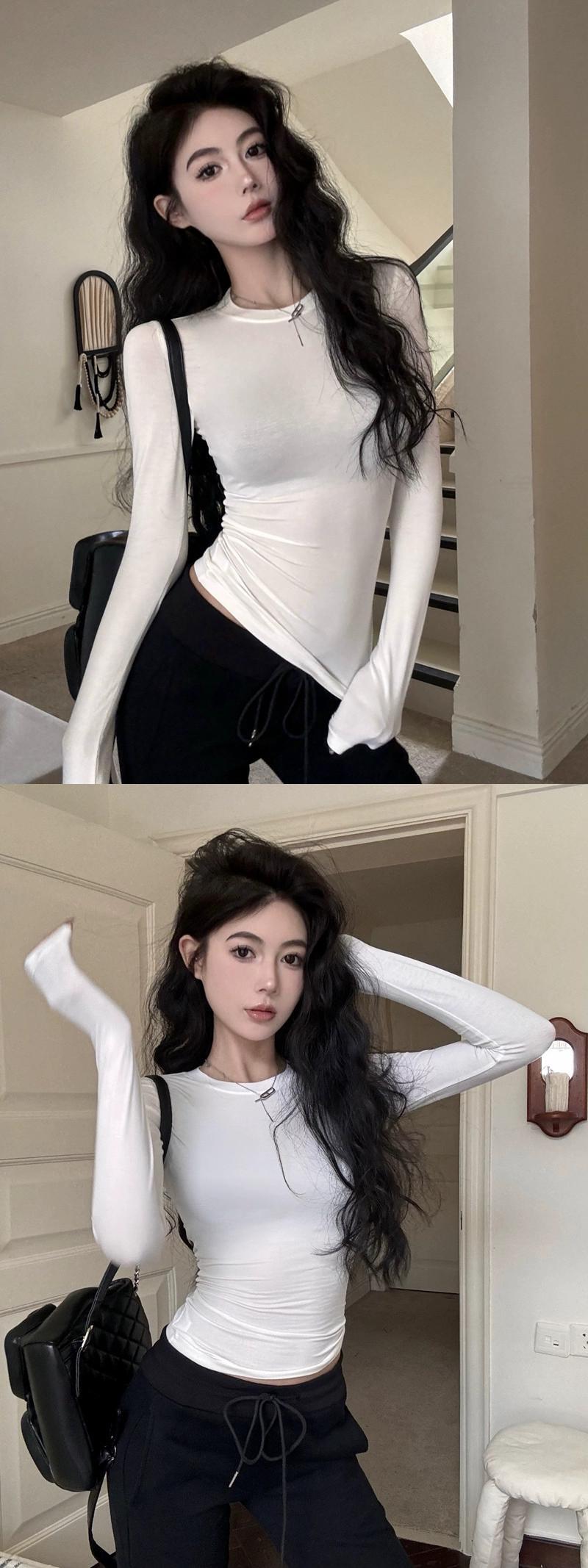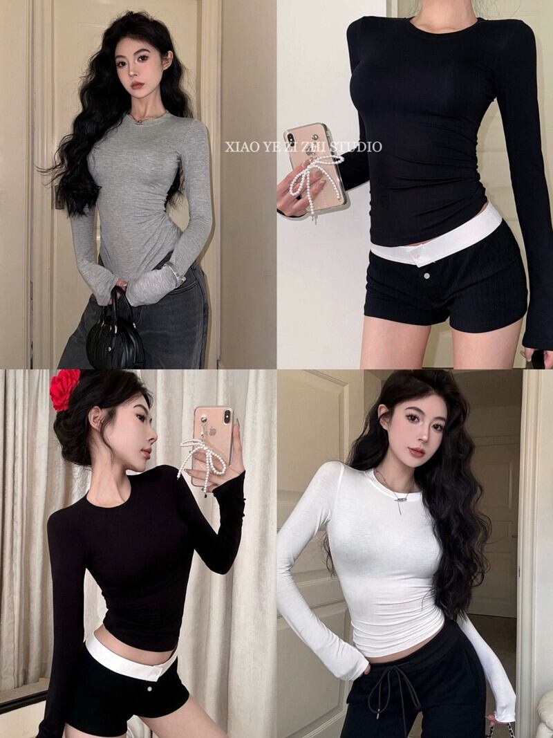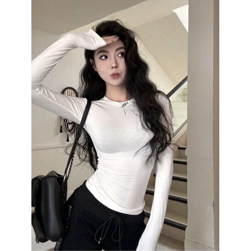 ニッチデザインラウンドネック長袖 Tシャツ女性春 2024 新しい多目的痩身底プルオーバートップ ロング スプリング 春物 Oネック 0921972329758548