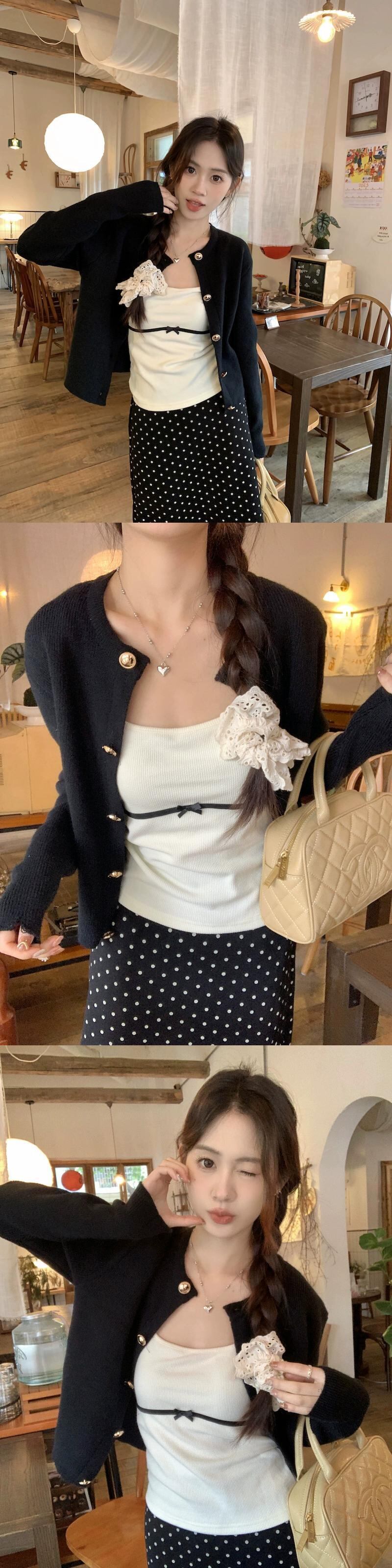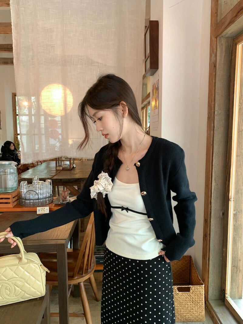 スタイルスモールスタイルスーツレディース、ショートニットジャケット内側ベスト付き、早春水玉Aラインスカート3点セット スプリング 春物 0921987373120262