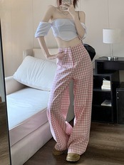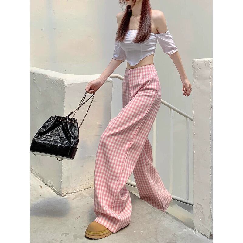 薄いピンクのチェック柄パンツ女性の春 2024 ウエストスリム多用途ストレートレッグルーズパンツ スプリング 春物 0921939964506547