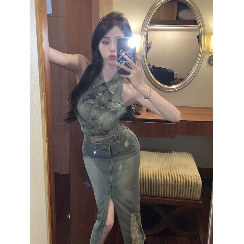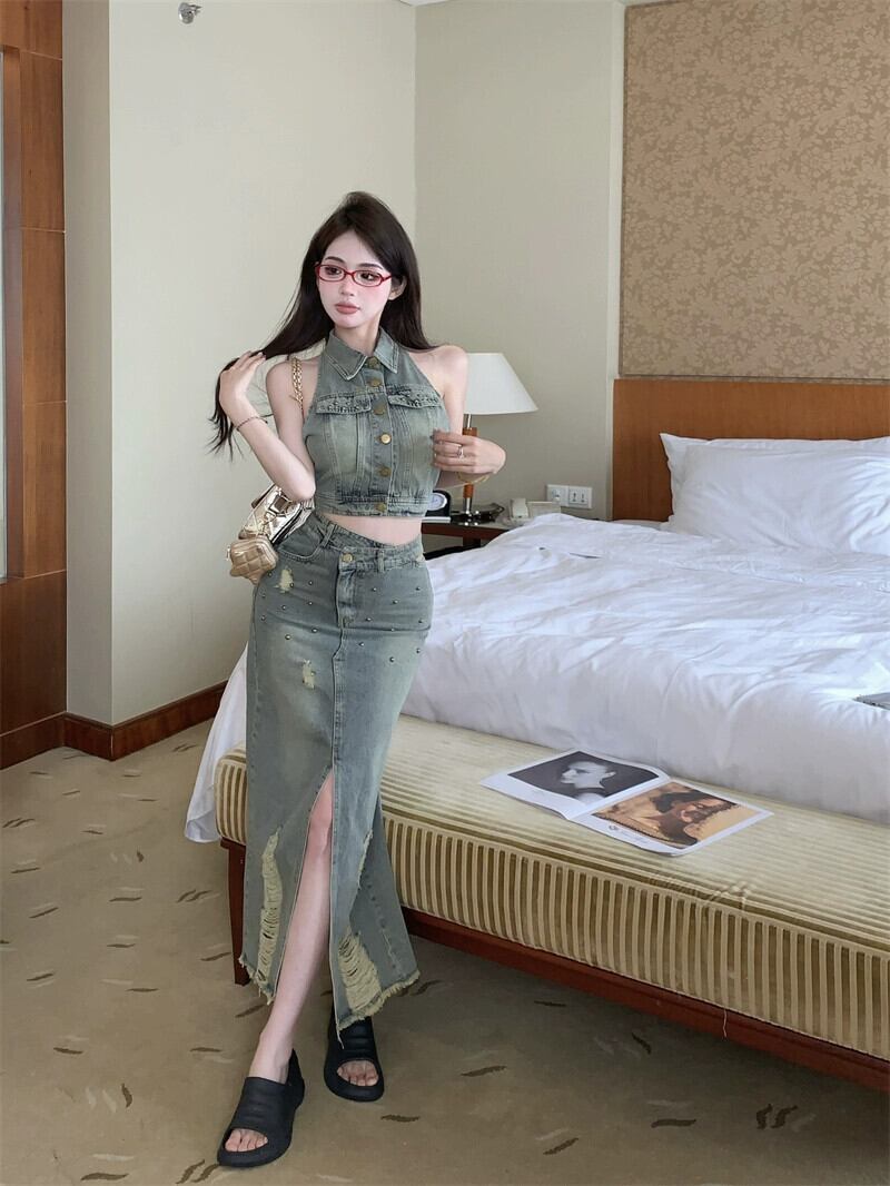 ミレニアルホットガールデニムスーツスカートレディースノースリーブホルターベストトップ春ウエストスリットスカート 2 点セット スプリング 春物 0921969670146721