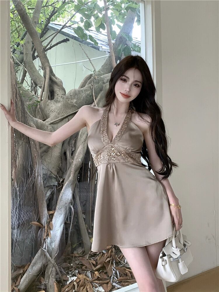 重工業レンガ V ネック ホルター ドレス レディース 2024 年春スタイル - ウエスト痩身 A ライン スカート スプリング 春物 Vネック Aライン 0921955538671491