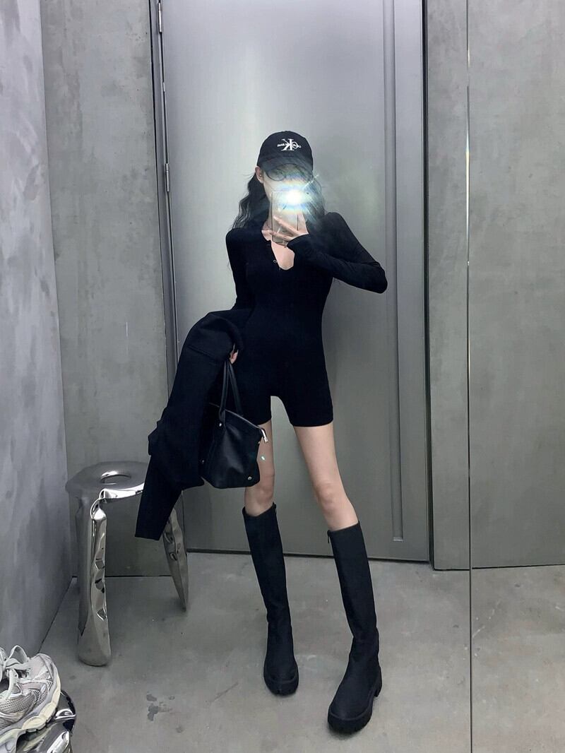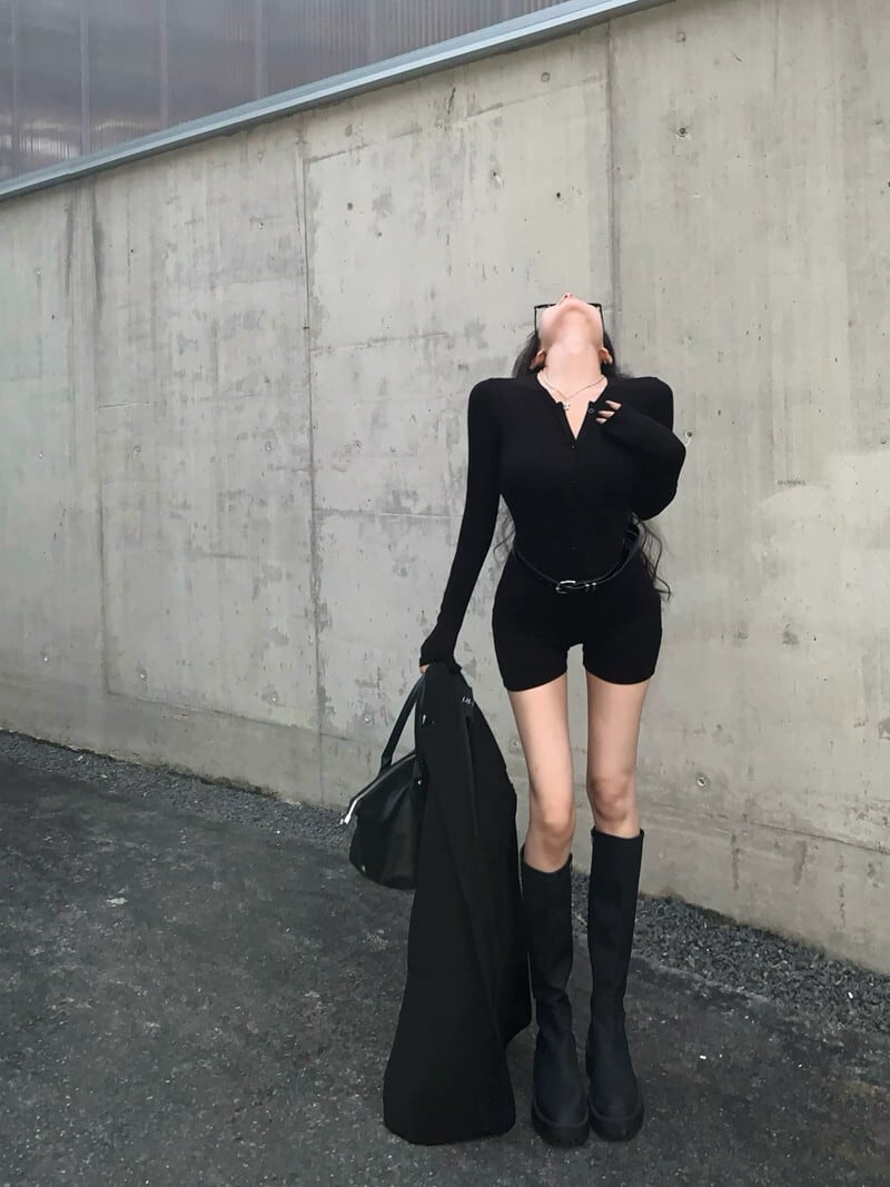 アメリカンスタイルのタイトな長袖 Tシャツの女性の 2024 年春の新しい黒のスポーツショーツとワンピーストップ ロング ブラック スプリング 春物 ブルマー 0921971877782927