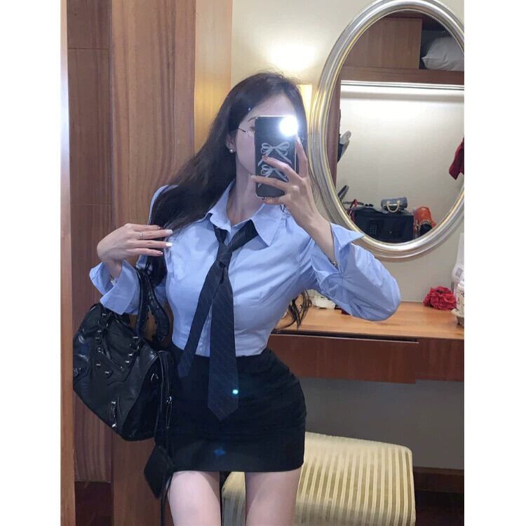 スタイルウエストネクタイ長袖シャツ女性の春のファッションスーツハイウエストヒップスカートスカートショートスカートツーピースセット ハイウェスト ロング スプリング 春物 0921978869642316