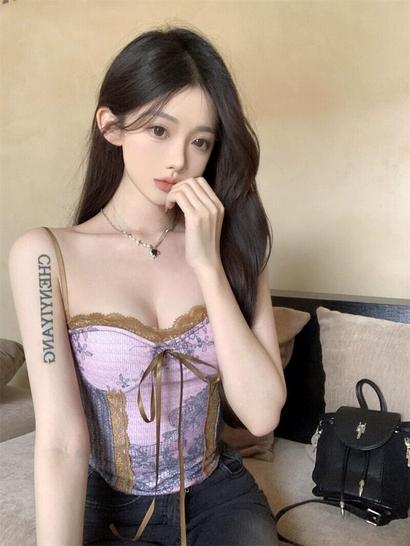レトロレースカラーブロックキャミソールレディース2024年春新作気質ショートスリムスリムトップトレンディ スプリング 春物 0921992997509570