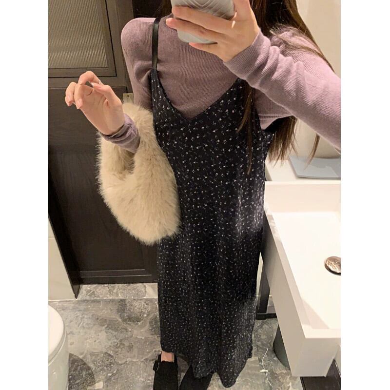 レトロベルベット花柄 V ネックサスペンダードレス女性の 2024 春の新しいスタイルのウエスト痩身 A ラインロングスカート スプリング 春物 Vネック Aライン 0921979635716887