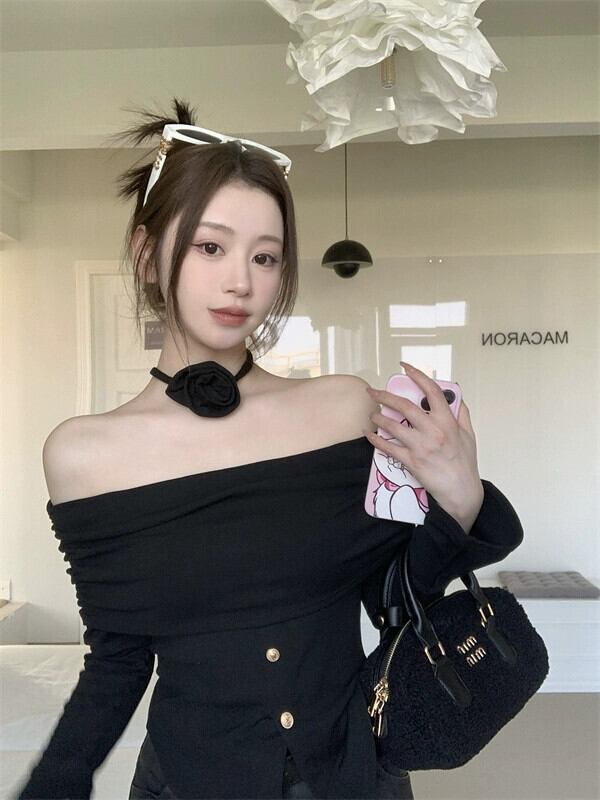 エドワンワードカラーレースアップフラワーTシャツレディース2024年春新作スリムフィットシック長袖トップ ロング スプリング 春物 フラワーデザイン 0921929990140648