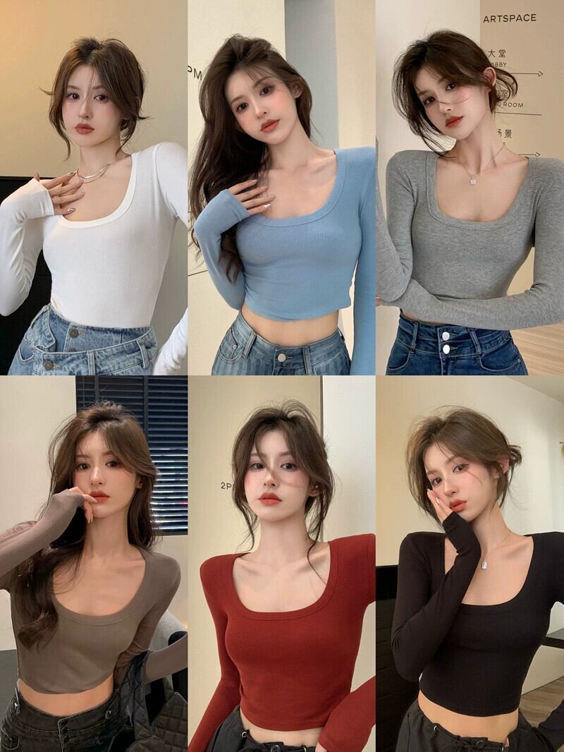 ホットスタイル U ネックストレッチ長袖 Tシャツ女性春 2024 新しいセクシーなショートスタイル痩身ボトシャツトップ ロング スプリング 春物 0921977490338848