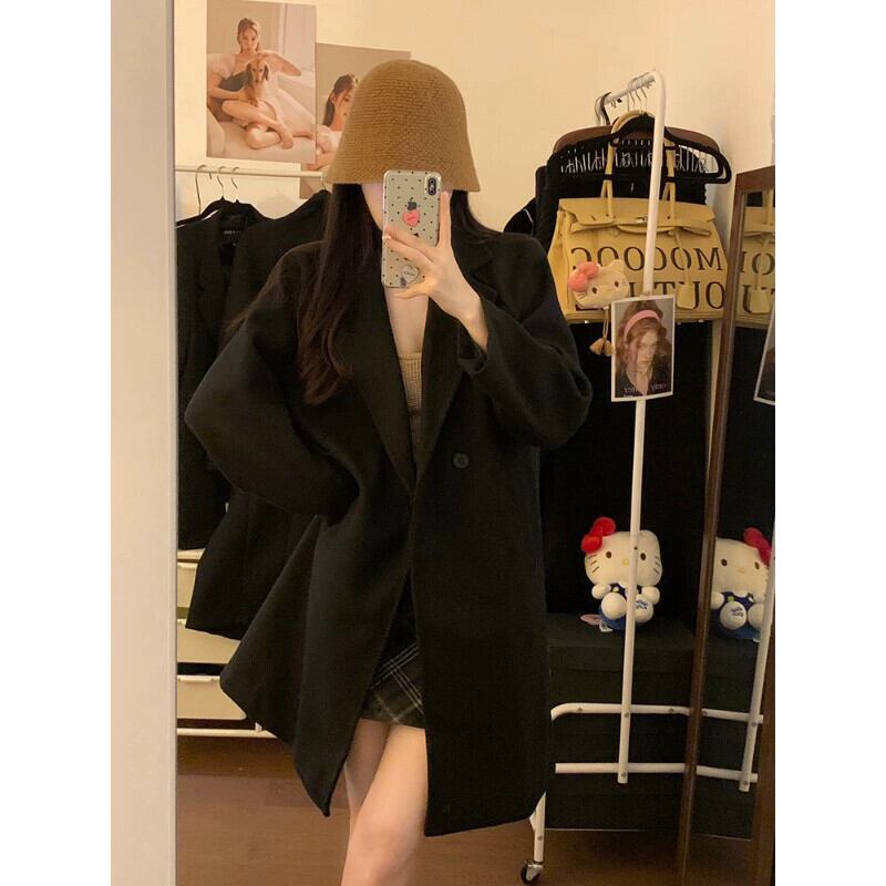 -終了黒長袖ウールコート女性の冬2024新しいロングルーズスリムカーディガンウールコート ブラック ウィンター 冬物 092197083222248