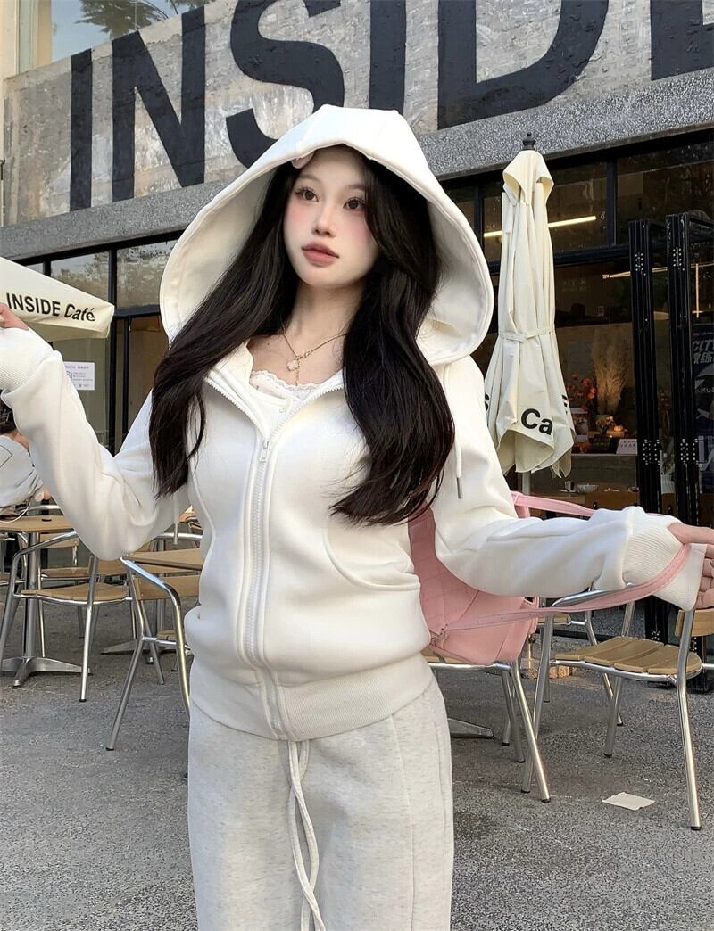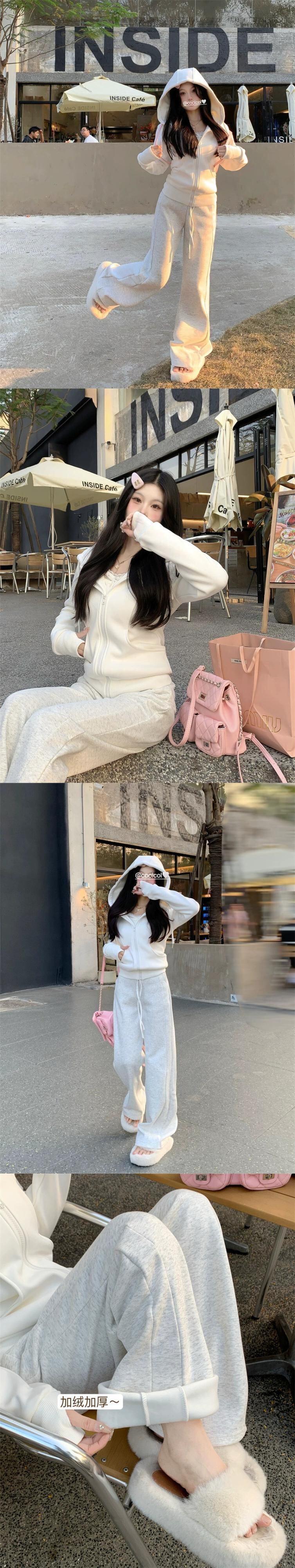カジュアルスーツ女性 2024 春の新しい長袖フード付きスウェットシャツとベルベットのストレートワイドレッグパンツ 2 点セット ロング スプリング 春物 0921996164168669
