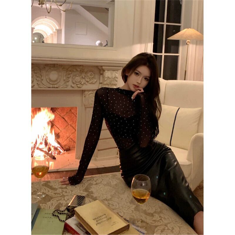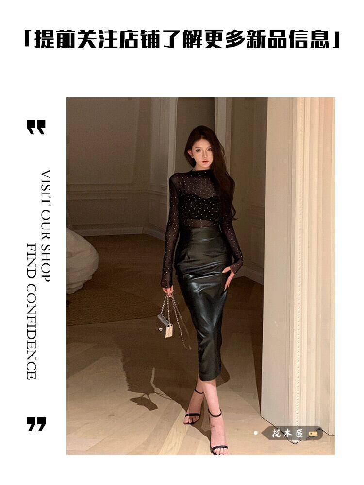 香港スタイルのファッションスーツ女性春ストレッチダイヤモンドメッシュ長袖 Tシャツサスペンダートップヒップカバーレザースカート 3 点セット ロング スプリング 春物 0921934252481318