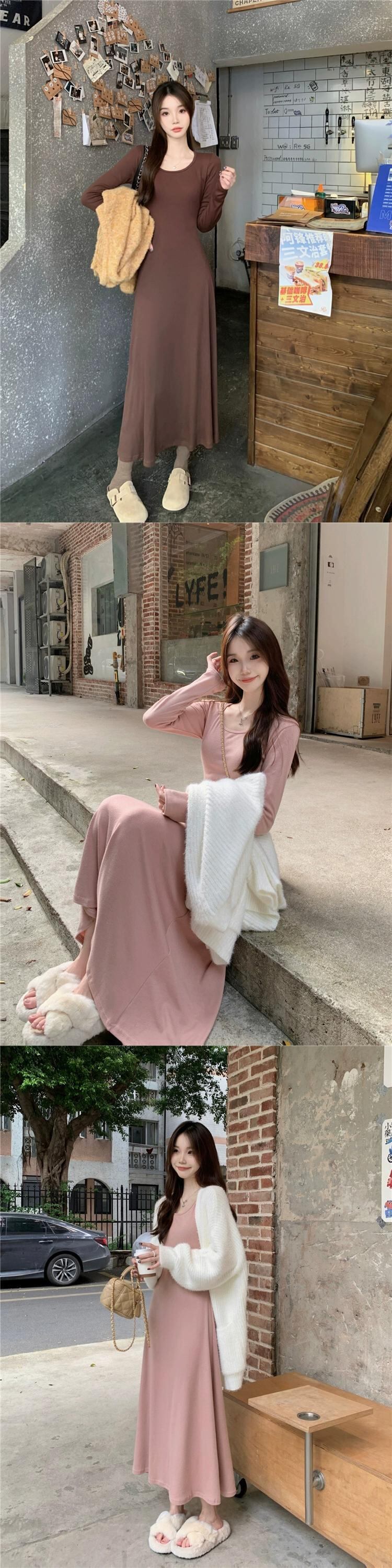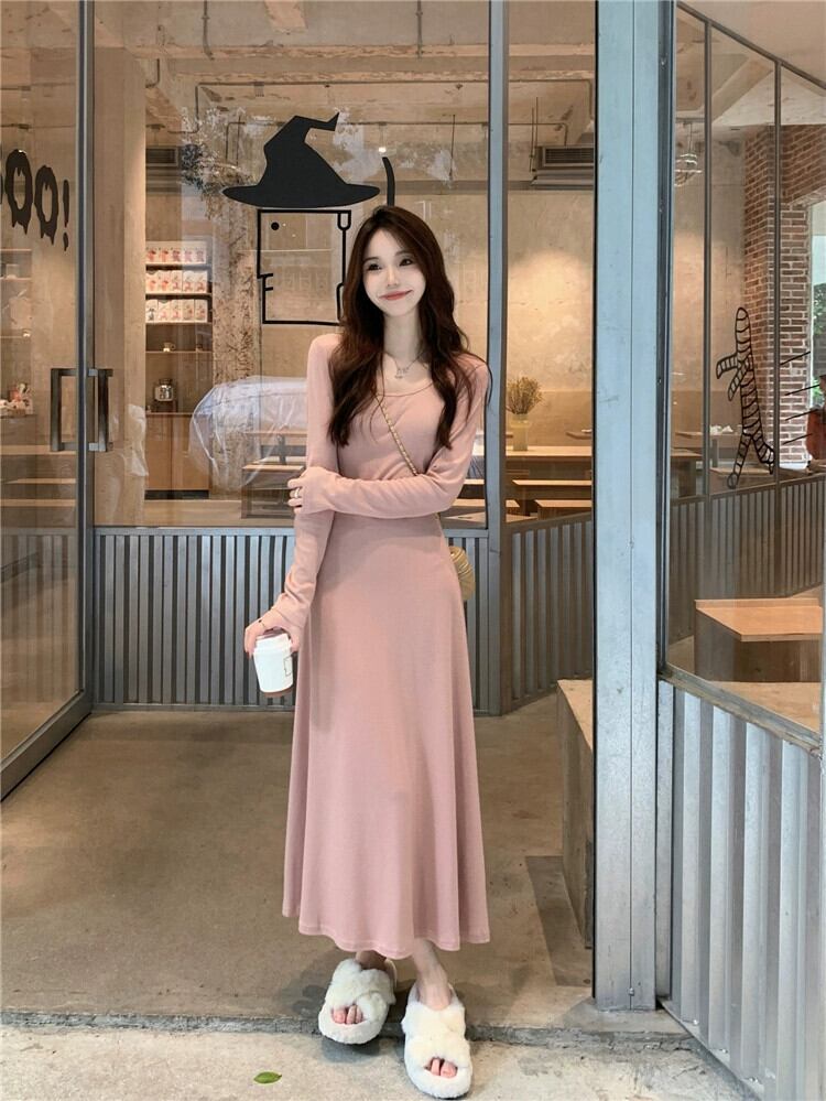 気質的なスクエアネック長袖ドレスの女性の 2024 年春の新デザイン痩身ミッドレングス A ラインスカート ロング スプリング 春物 Aライン スクウェア 0921986635395085