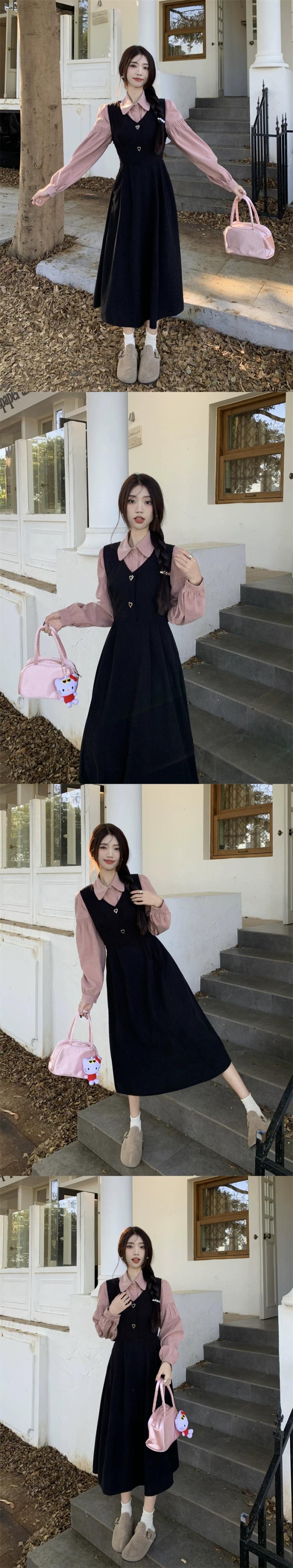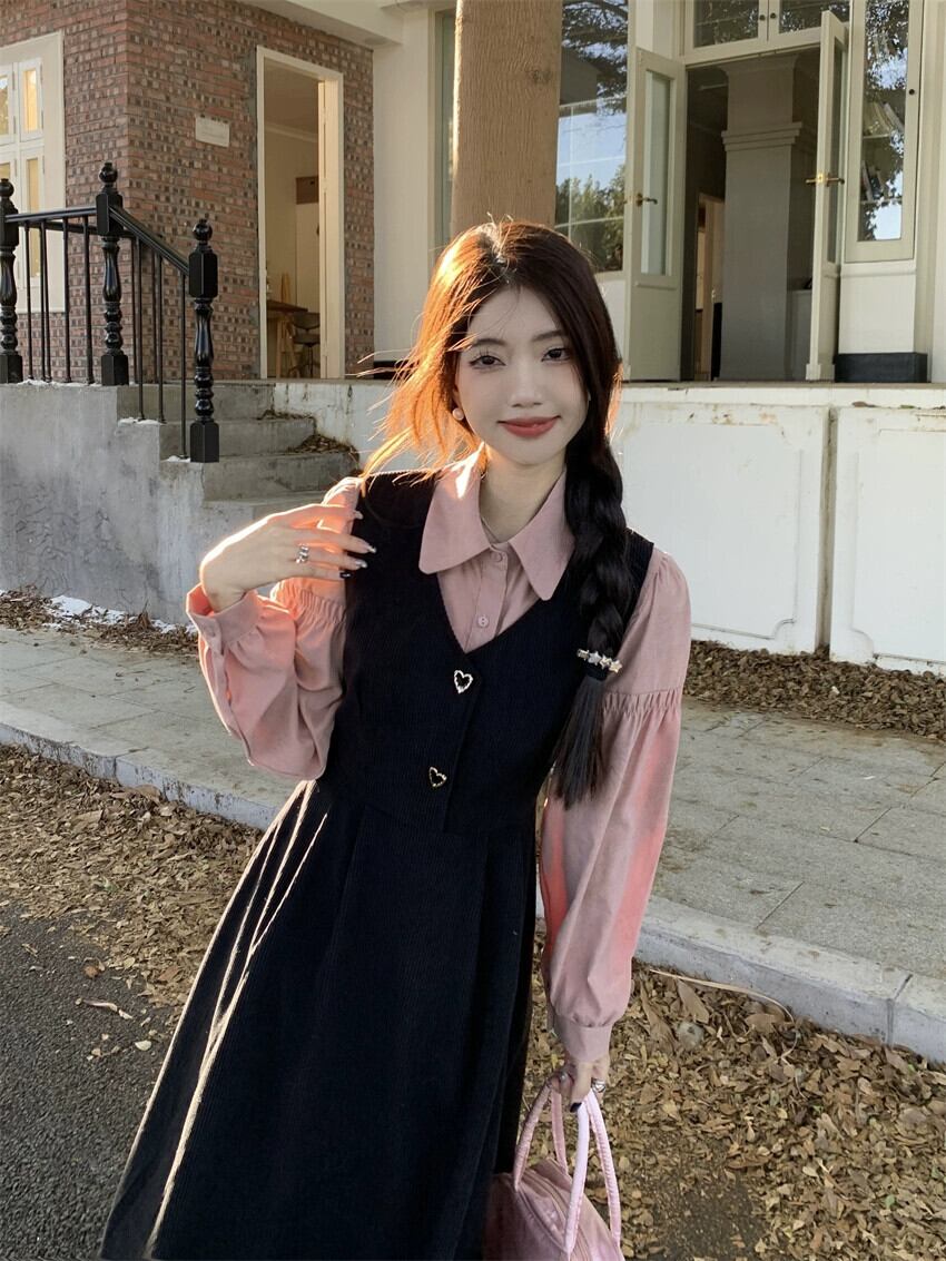 年齢を軽減するカレッジスタイルのスーツの女性春ピンクの長袖シャツと V ネックのベストドレスを重ねた 2 点セット ロング レッド スプリング 春物 Vネック 0921987131842692