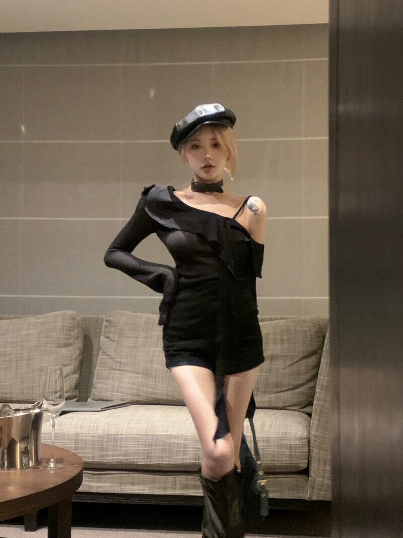 黒のフリル傾斜襟長袖オフショルダー セーター女性春の純粋な欲望スタイルのトップ、スリム フィットとベース レイヤー セーター ロング ブラック スプリング 春物 ピュア 0921933530618759