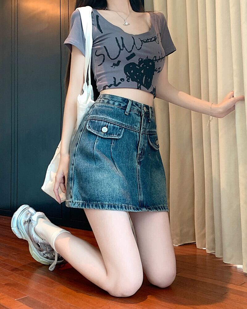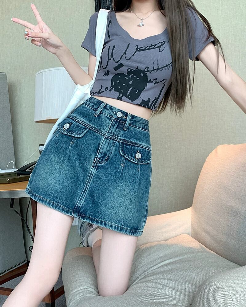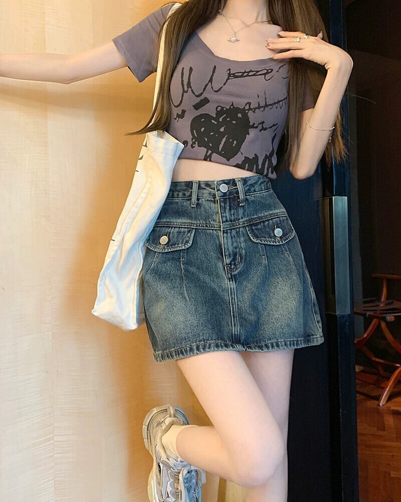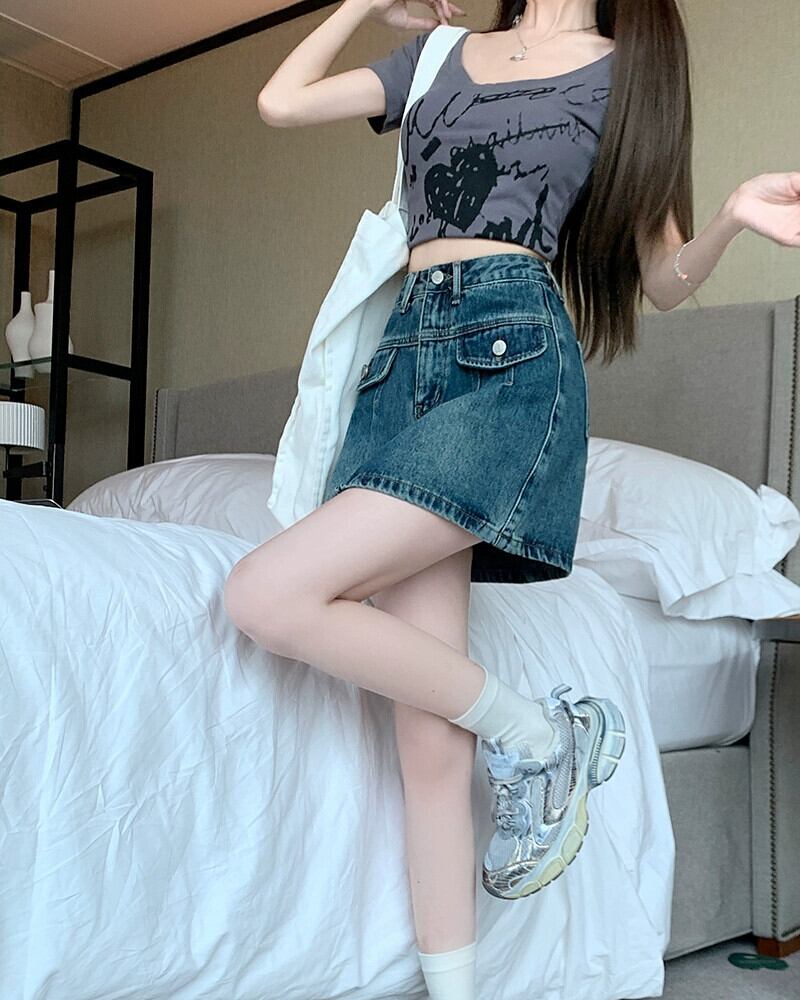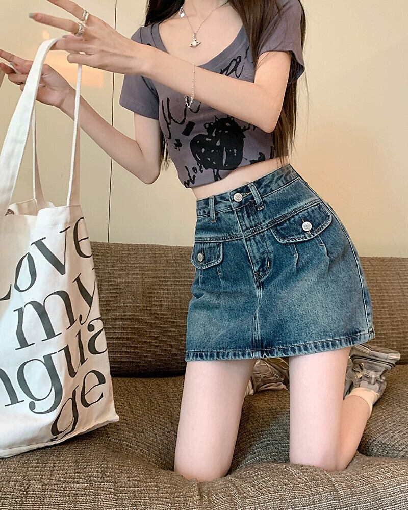 レトロウォッシュブルーダメージデニムスカート女性早春 2024 新しいハイウエスト A ラインスカートヒップスカートショートスカート ハイウェスト スプリング 春物 Aライン 0921948883130183