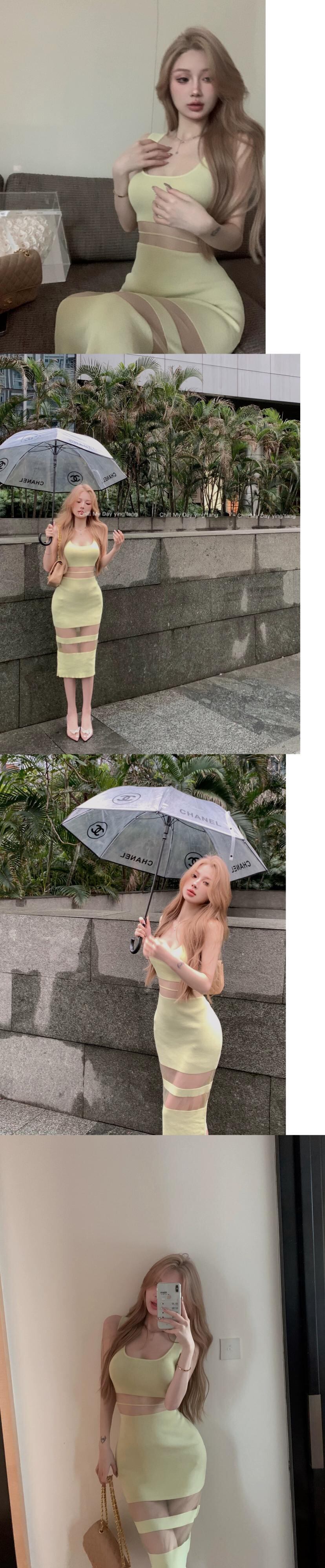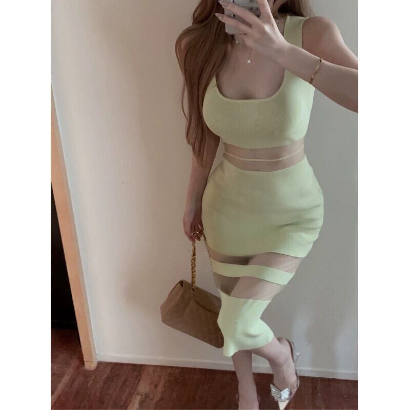セクシーなホットガール中空ノースリーブベストドレス女性の春 2024 スリムフィットニットミッドレングススカート スプリング 春物 0921982469491062