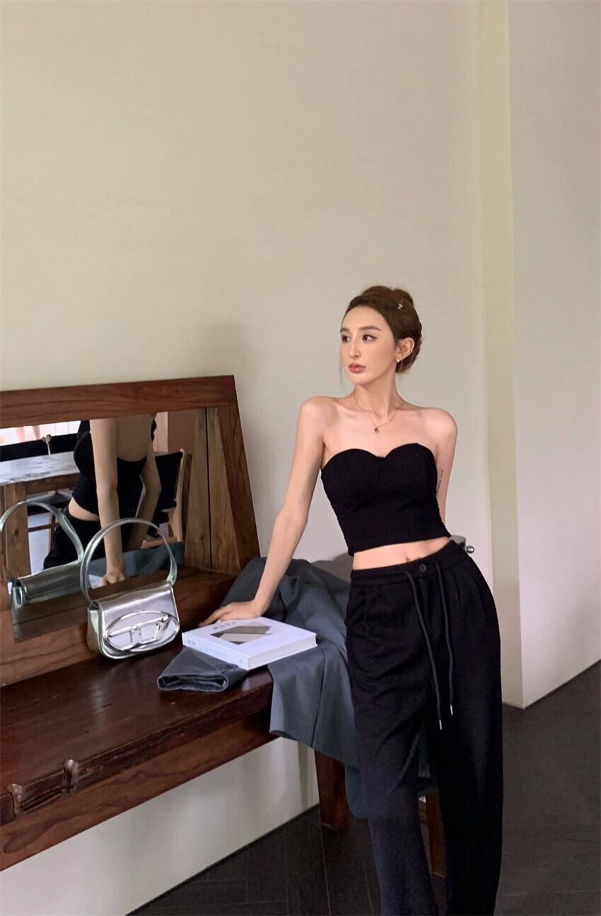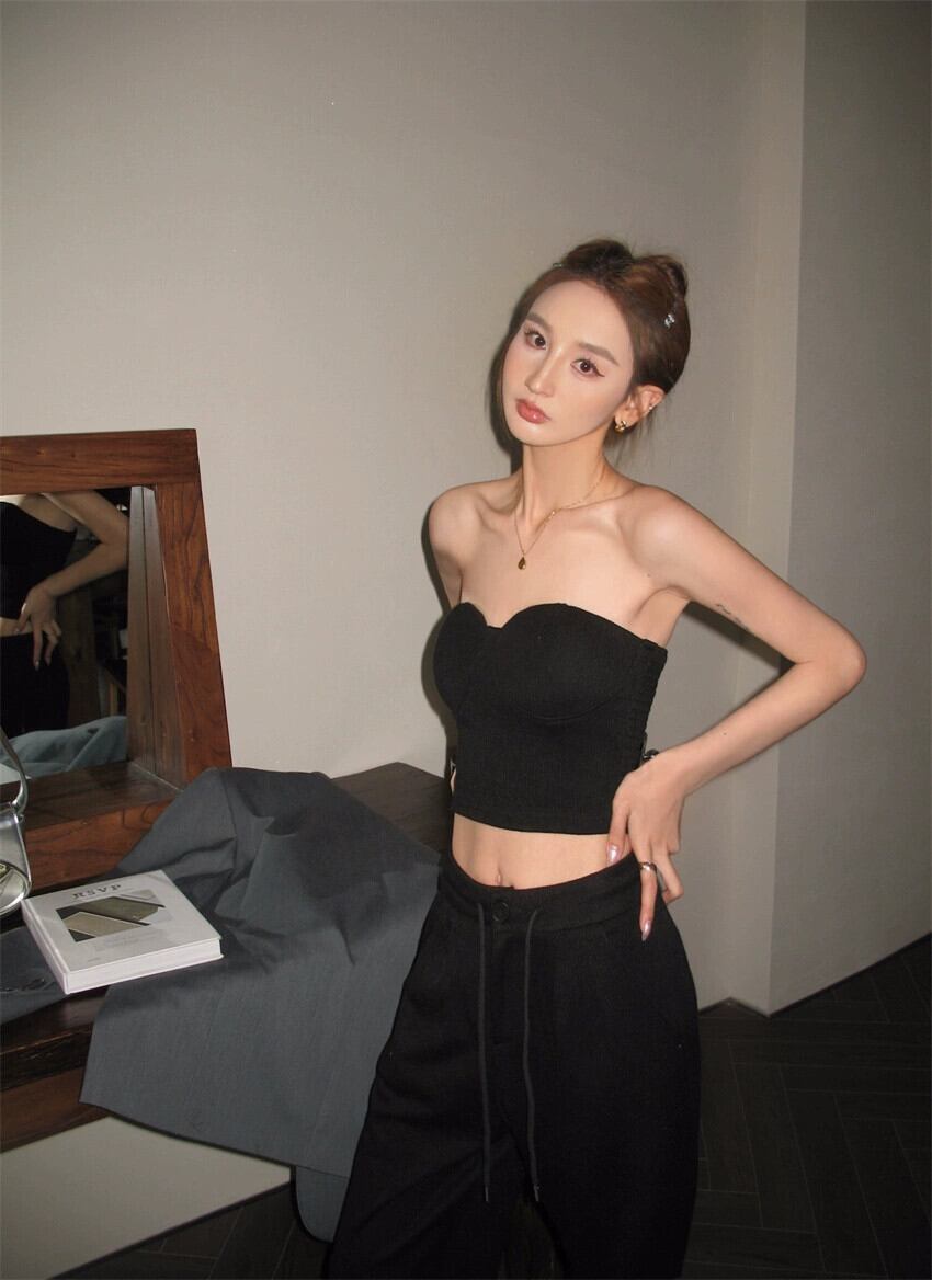 純粋な欲望の黒のストラップレス チューブ トップ女性の春のウエストがタイトで気質ショート露出防止インナー トップ ブラック スプリング 春物 0921951951056030