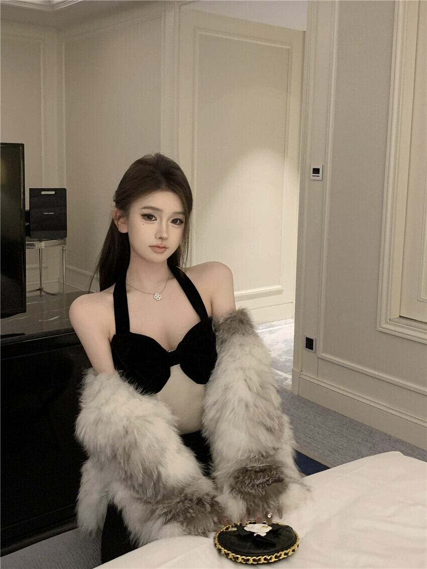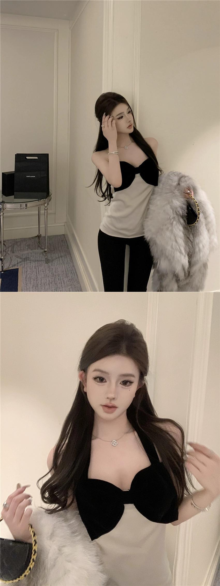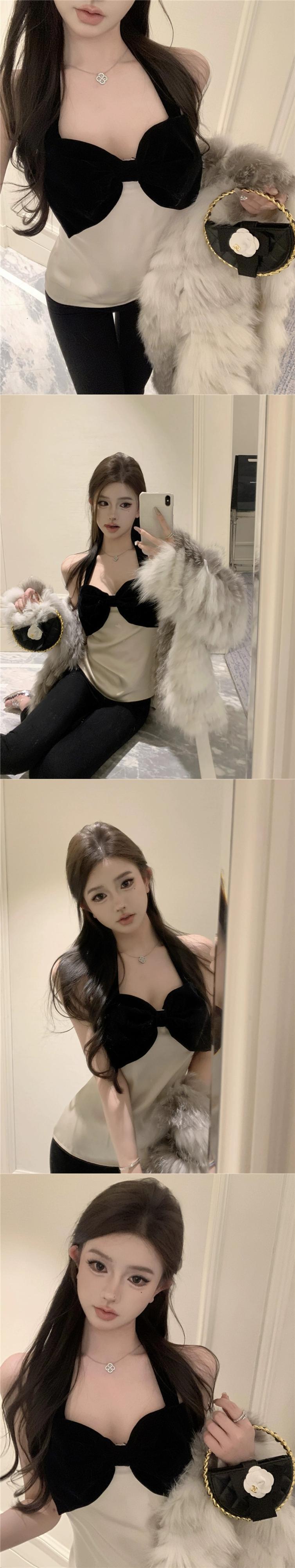 ピュアラストスタイルスプライシングボウホルターネックキャミソールレディース2024年春新作スリムフィットノースリーブトップ スプリング 春物 0921927855951482