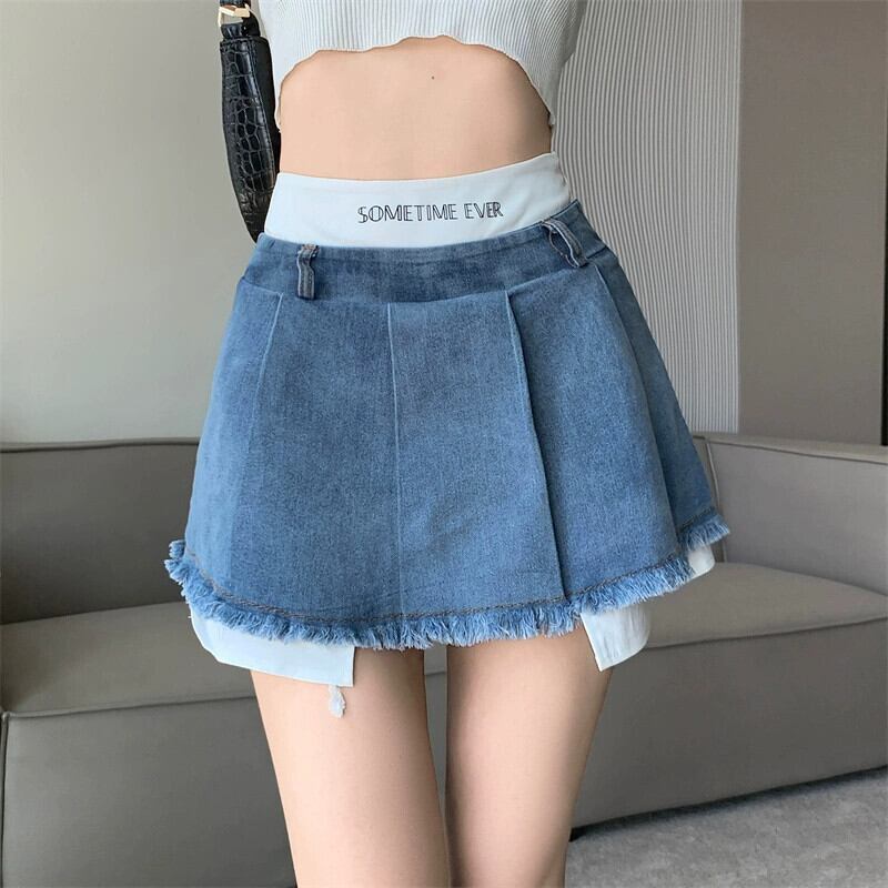 -ウエストスリムローエッジデニムスカートレディース2024年春の新デザインフェイクツーピースプリーツスカート スプリング 春物 0921975341631996