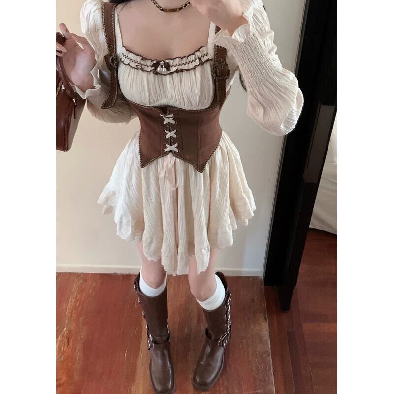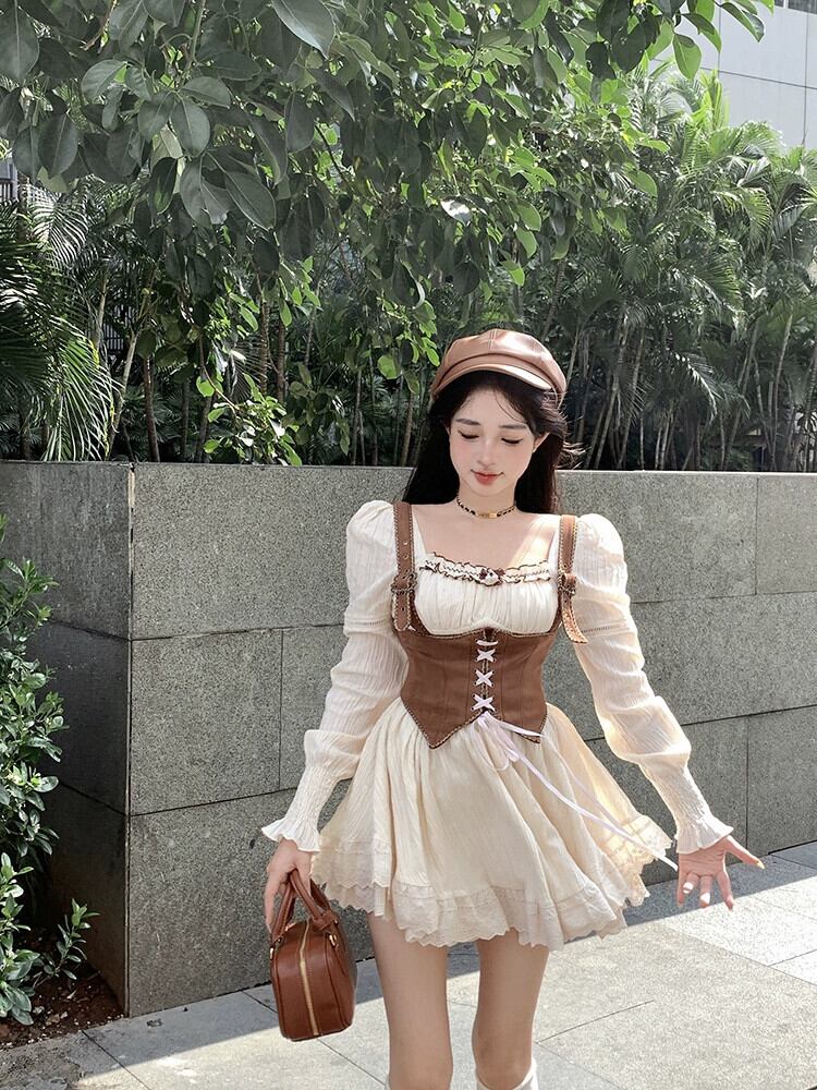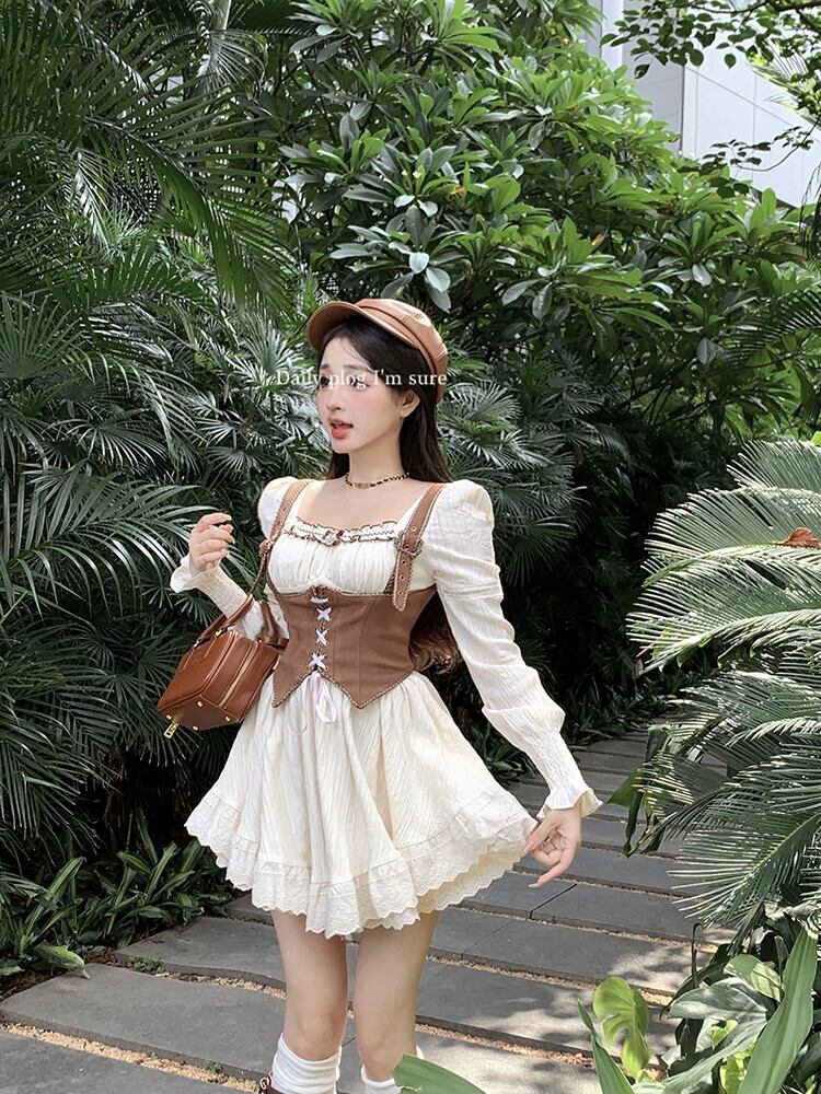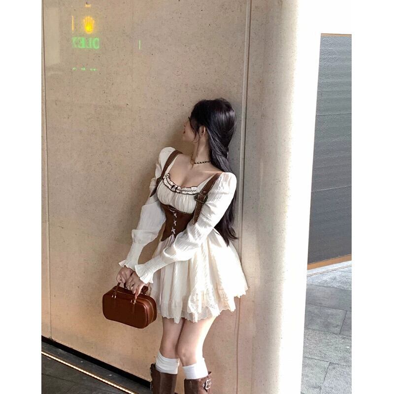 レトロな気質 y スタイルのスーツの女性の 2023 春の新しいスクエアネック長袖ドレスキャミソール 2 点セット ロング スプリング 春物 スクウェア 0921997799695732
