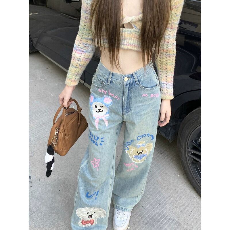 イン落書きプリントジーンズ女性春 2024 新しいアメリカンハイウエストルーズストレートワイドレッグパンツ長ズボン ロング スプリング 春物 0921966483827856
