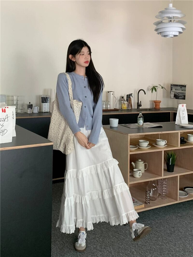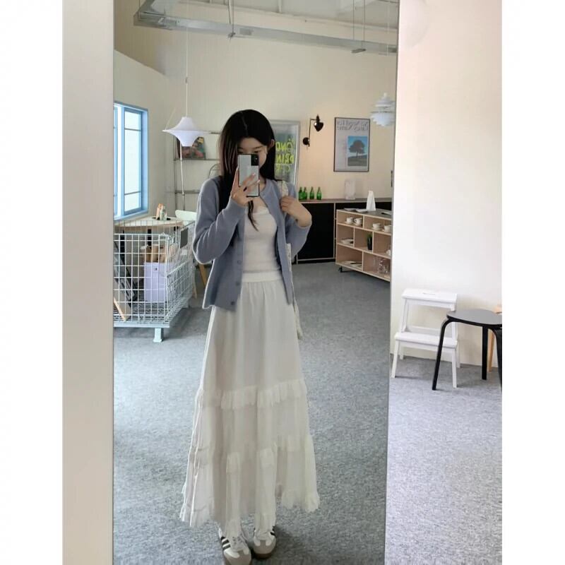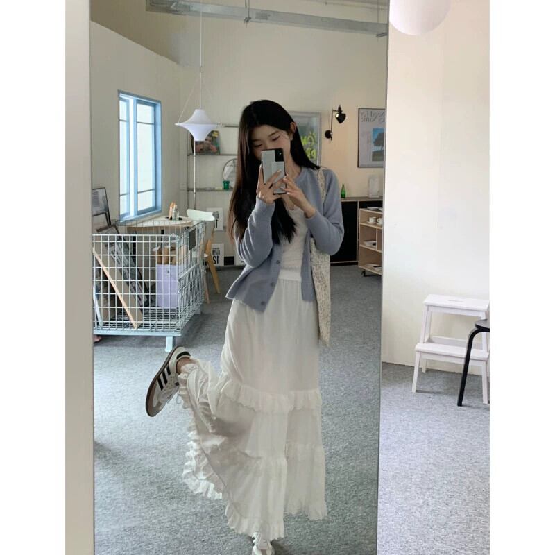 色:ホワイトサスペンダー,青いセーターカーディガン,白いスカート