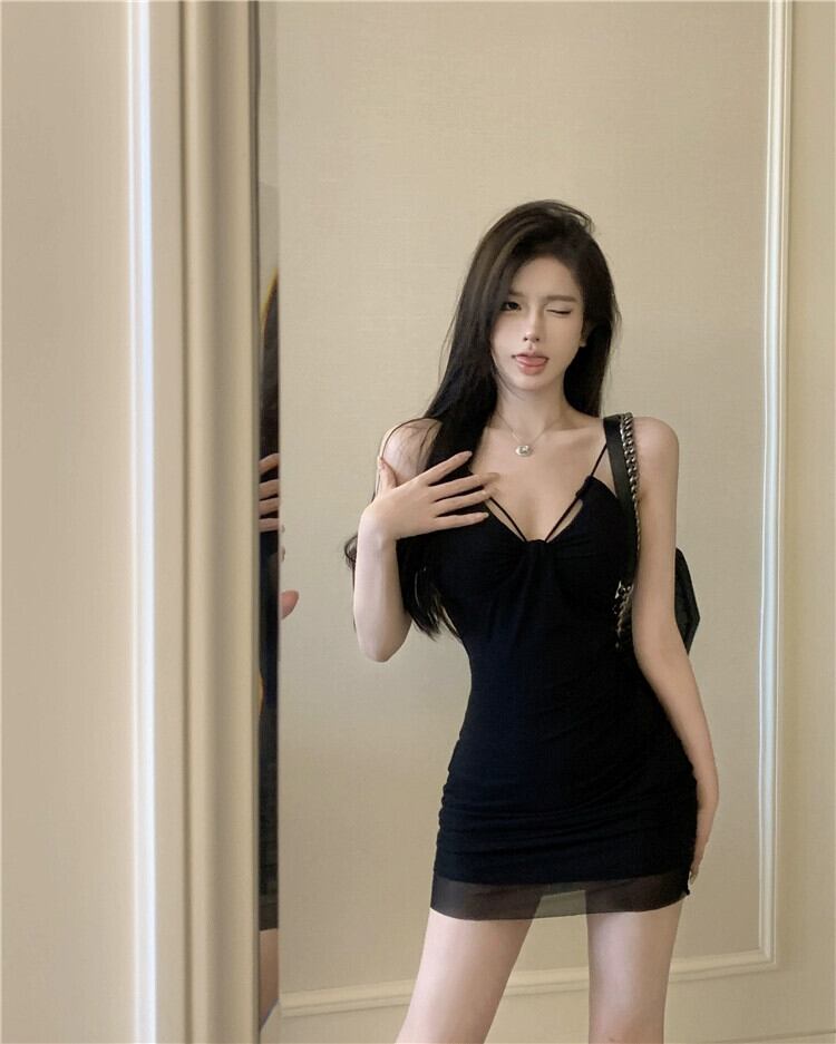 純粋な欲望 V ネックメッシュサスペンダードレス女性の春ウエストタイトヒップハグスカート黒のミドル丈スカート胸パッド付き ブラック スプリング 春物 Vネック 0921916285213294