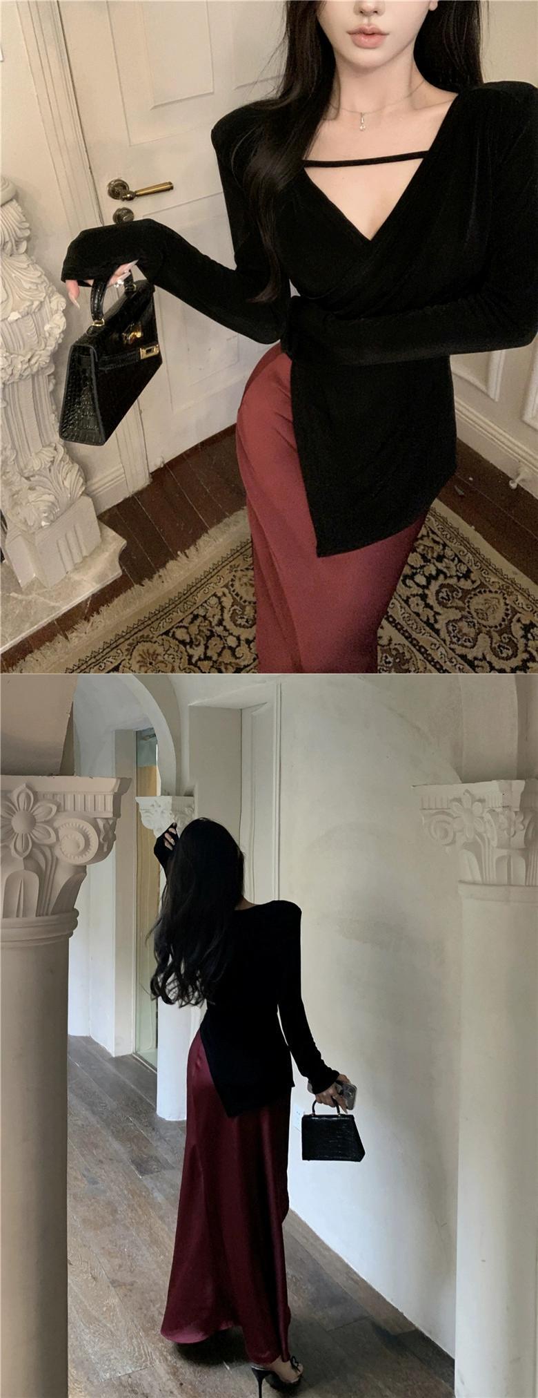 レトロハイエンドセクシーなツーピースセット女性春 2024 新しい V ネック長袖不規則な Tシャツスリットスカートスーツ ロング スプリング 春物 Vネック 092191247108224