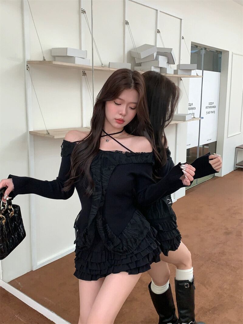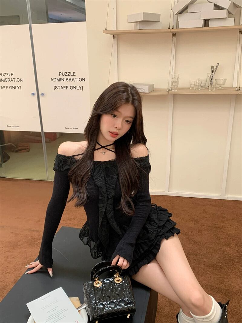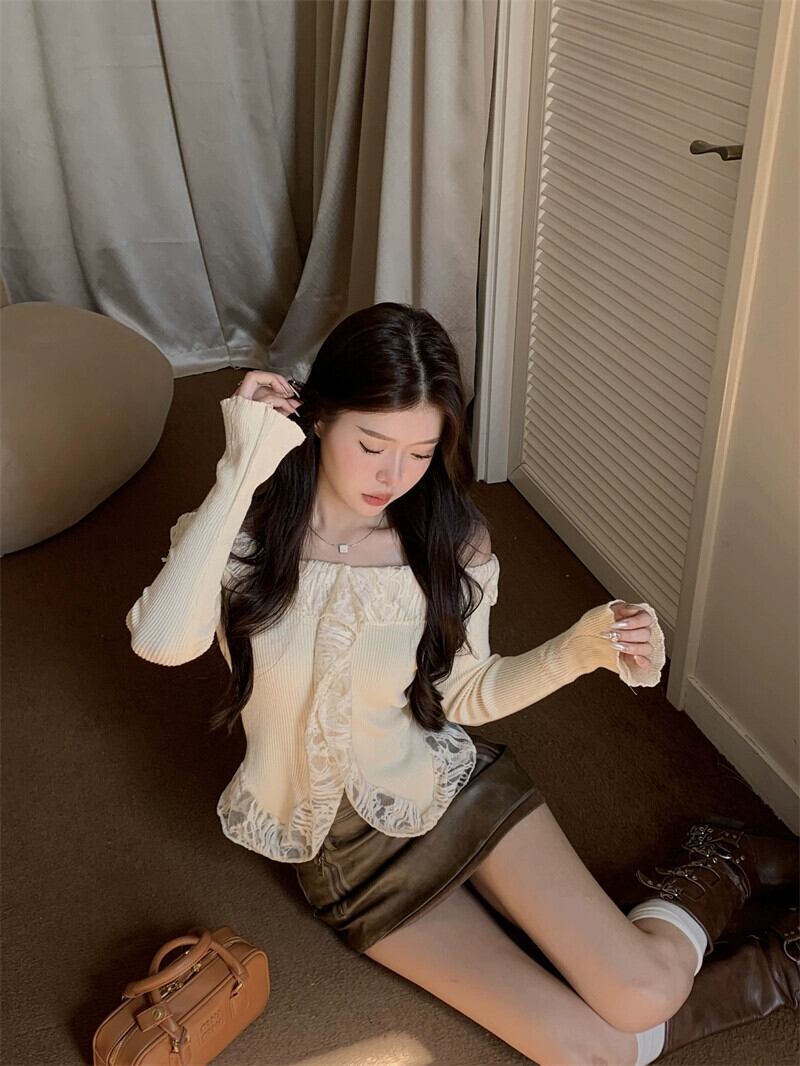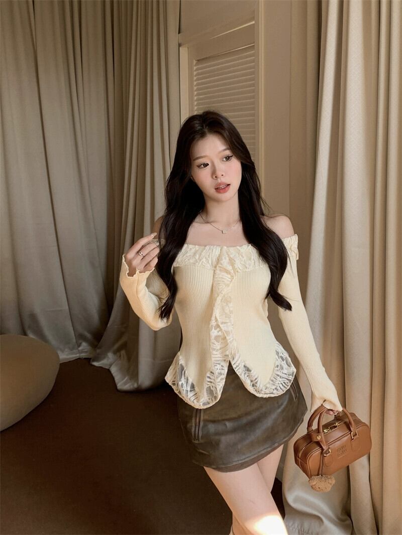 純粋な欲望スタイルワンショルダー蓮の葉襟セーター女性の 2024 年春の新しいレーススプライシング長袖プルオーバートップ ロング スプリング 春物 0921943736592011