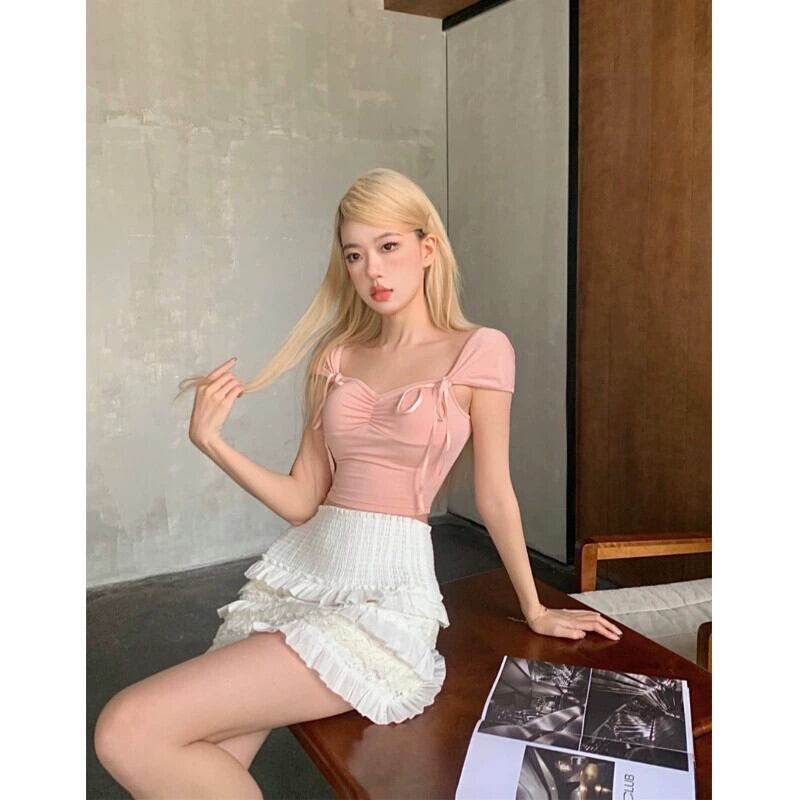 甘いレースアップ V ネック T シャツの女性の 2024 年春の新しいプリーツ スリミング ショート ボトム トップ 大人ガーリー スウィート キュート カジュアル スプリング 春物 Vネック Tシャツ 0921949426922893