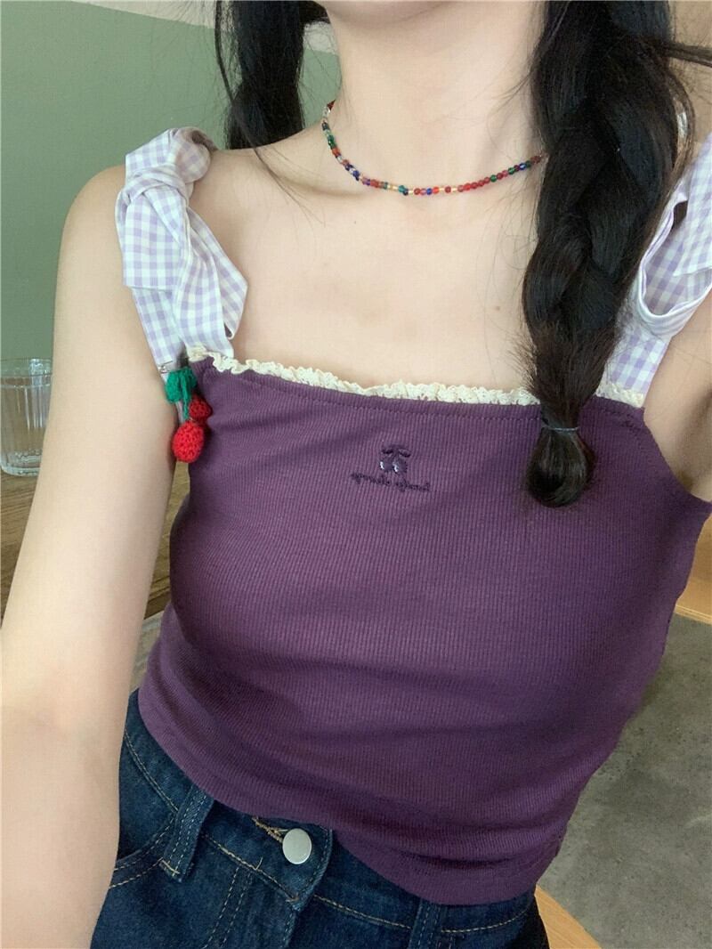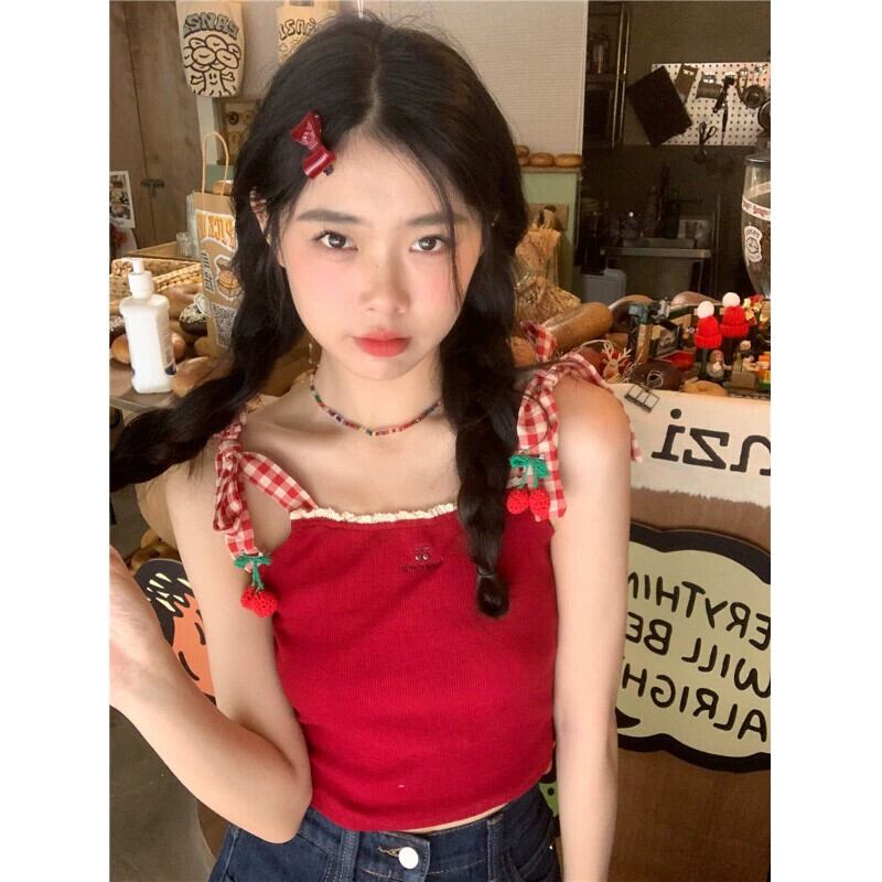 甘いスタイルの刺繍レースチェック柄キャミソール女性春 2024 新しいスタイルショートスリムフィットトップ レッド 大人ガーリー スウィート キュート カジュアル スプリング 春物 0921963366389923