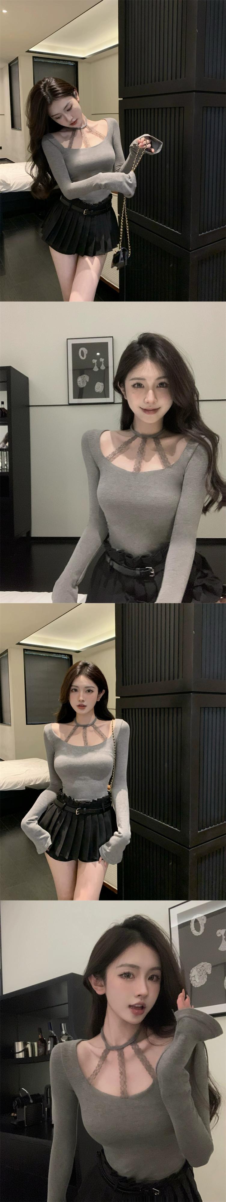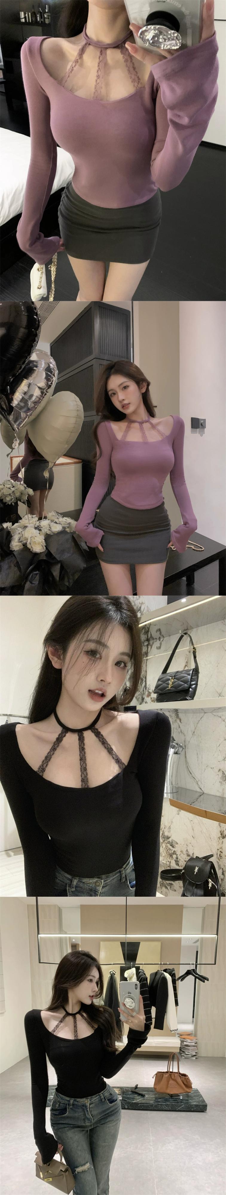 無地レースホルターネック長袖セーター女性春 2024 新スタイル純粋な欲望優しいスリムショートボトミングトップ ロング スプリング 春物 ピュア ソリッドカラー 0921926327420742